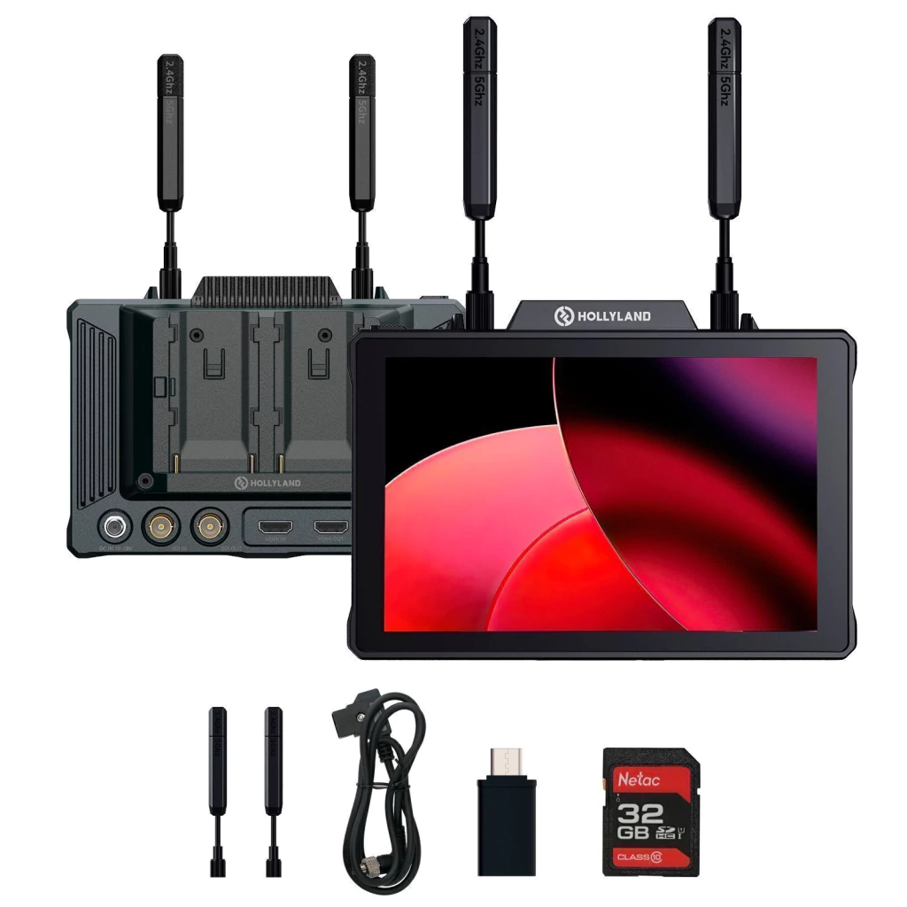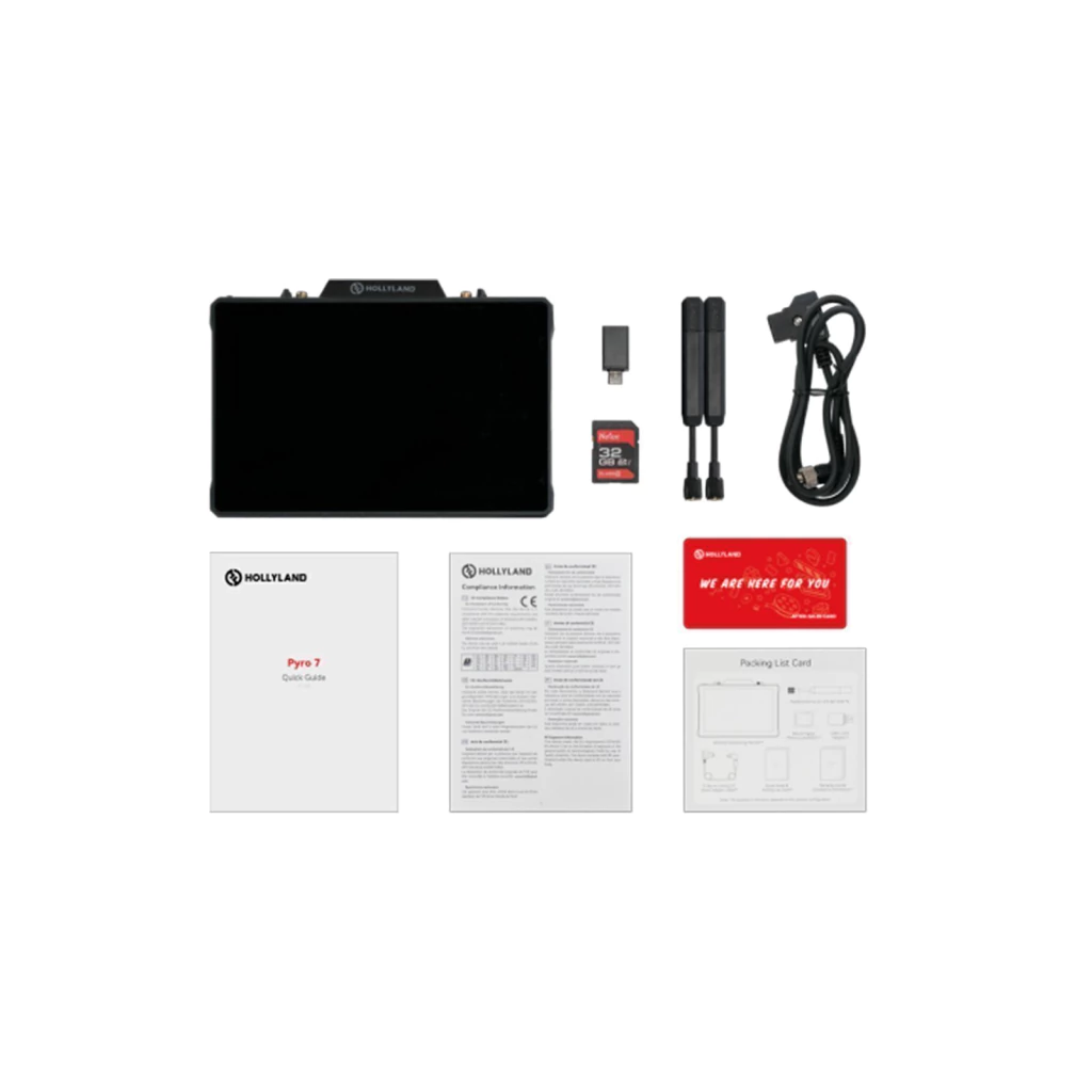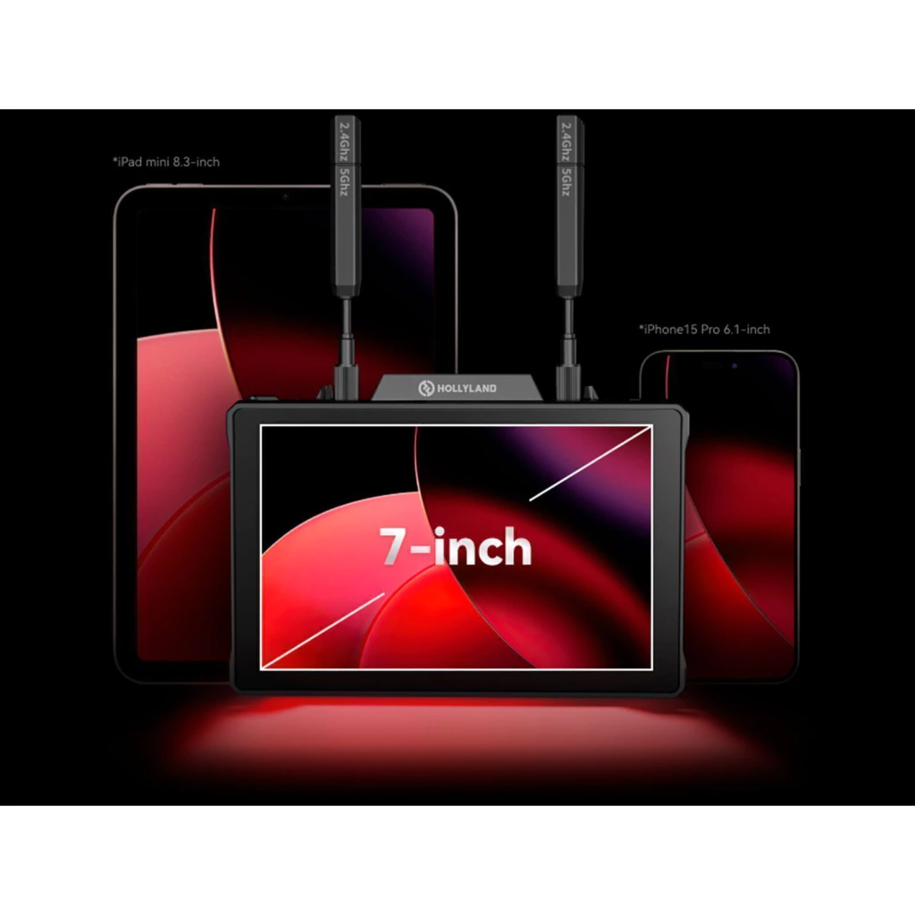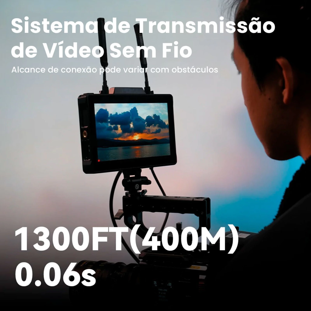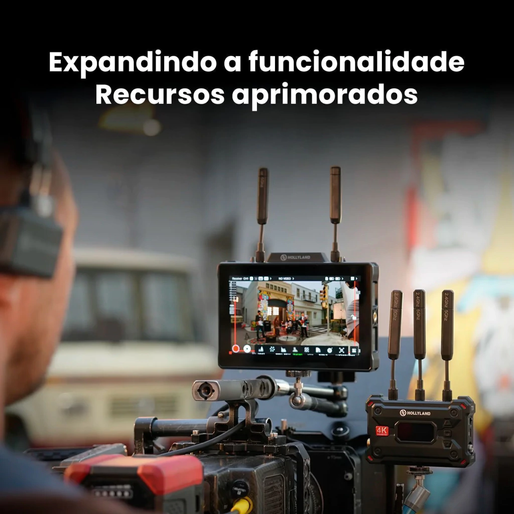 Transmita, receba e monitore transmissões de vídeo sem fio de alta qualidade usando o versátil Monitor Transceptor Sem Fio Pyro 7 da Hollyland. O Pyro 7 pega o transceptor/monitor M1 anterior e o torna maior e melhor com uma tela sensível ao toque de 7", placa de bateria dupla série L, transmissão sem fio a até 400 metros de distância, ferramentas de imagem HollyOS atualizadas, gravação de vídeo em cartão SD, entrada/saída HDMI/SDI, streaming RTSP, um Pyro 7 envia para até quatro receptores, além de salto automático de banda dupla de 2,4/5 GHz e salto automático de frequência. ESPECIFICAÇÕES TÉCNICAS: Tipo de painel: LCD Tamanho da tela: 7,0" / 17,8 cm Resolução Nativa: 1920 x 1200 Proporção da tela: 16:9 Tela sensível ao toque: Sim Brilho máximo: 1200 lêndeas / cd/m 2 Taxa de contraste: 1000:1 Suporte HDR: Não Suporte LUT: Sim Controles de imagem: Pico de foco, forma de onda Antena E/S: 2x RP-SMA Macho E/S de vídeo: 1x Entrada BNC (3G-SDI) 1x Saída BNC (3G-SDI) 1x Entrada HDMI 1.4b 1x Saída HDMI 1.4b Áudio incorporado: HDMI/SDI: 8 canais E/S de áudio: 1 saída de fone de ouvido de 1/8" / 3,5 mm Alto-falante embutido: Não E/S de energia: 1x Entrada de Barril Outras E/S: 1 entrada USB-C (firmware) Slot para cartão de mídia/memória: Slot único: SD/SDHC/SDXC [Suporta gravação] Criptografia: Não Alcance sem fio: 396,2 m (Linha de Visão) 198,1 m Largura de banda do canal: 40 MHz, 20 MHz Faixa de frequência: EUA: 5,1 a 5,8 GHz EUA: 2,412 a 2,484 GHz Latência: 60 ms Potência de RF: 23 dBm Sensibilidade de RF: -80 dBm Bluetooth: Sim