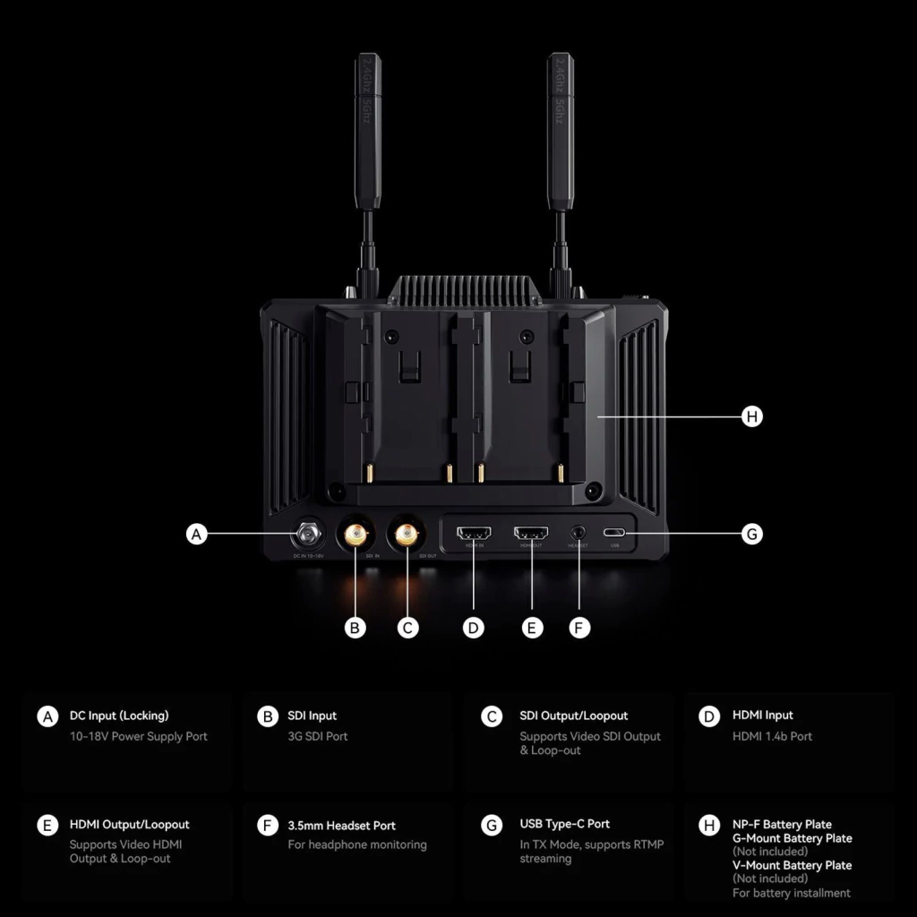 Compatível com aplicativo móvel Sim (obrigatório): Nome do aplicativo Android e iOS: HollyView Funcionalidade: Ajustar configurações, atualização de firmware, controle remoto, configuração, visualizar transmissão ao vivo Suporte de formato Formato de vídeo: HDMI: UHD 4K: 30/29.97/25/24/23.98 1080p: 60/59.94/50/30/29.97/25/24 1080i: 60/59.94/50 720p: 60/59.94/50 SDI: 1080p: 60/59.94/30/29.97/24/23.98 1080i: 60/59.94/50 720p: 60/59.94/50 Formato de áudio: 4 canais Compressão de vídeo sem fio: Comprimido Registro pré-rolagem: Não Suporte para legendas ocultas: Não Entrada de referência: Não Alimentação fantasma: Não Potência de entrada: 10 a 18 VCC a 2,5 A Bateria: 2x Montagem da Série L na placa intercambiável incluída Consumo de energia: 22 W (máximo) Montagem de tripé/acessório: Inferior/Esquerda/Direita: 1x 1/4"-20 Fêmea Resistência Ambiental: Não Condições de operação: -10 a 45°C Condições de armazenamento: -40 a 60°C Material de construção: Alumínio, Magnésio Dimensões: 180 x 127 x 31,8 mm (excluindo antena) Peso: 54 g, excluindo antena ITENS INCLUSOS: 01 Monitor transceptor sem fio Hollyland Pyro 7 02 Antenas de remo 01 Cartão SD 01 Conversor USB-C 01 Cabo de alimentação CC com trava D-Tap Garantia Limitada de 12 meses