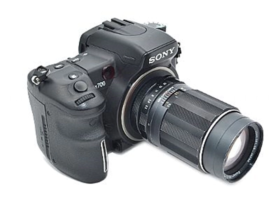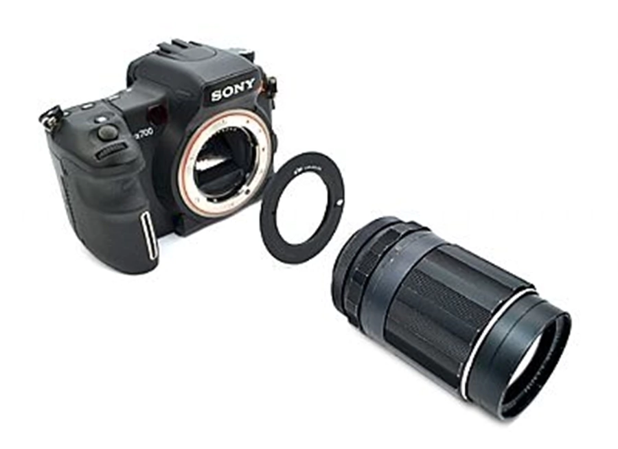 Foto do adaptador montado em uma camera Sony Alpha com uma objetiva de rosca M42,confira.