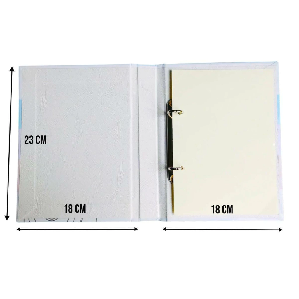 Dimensões álbum: 18 cm (largura) x 23 cm (altura) x 3 cm (espessura)