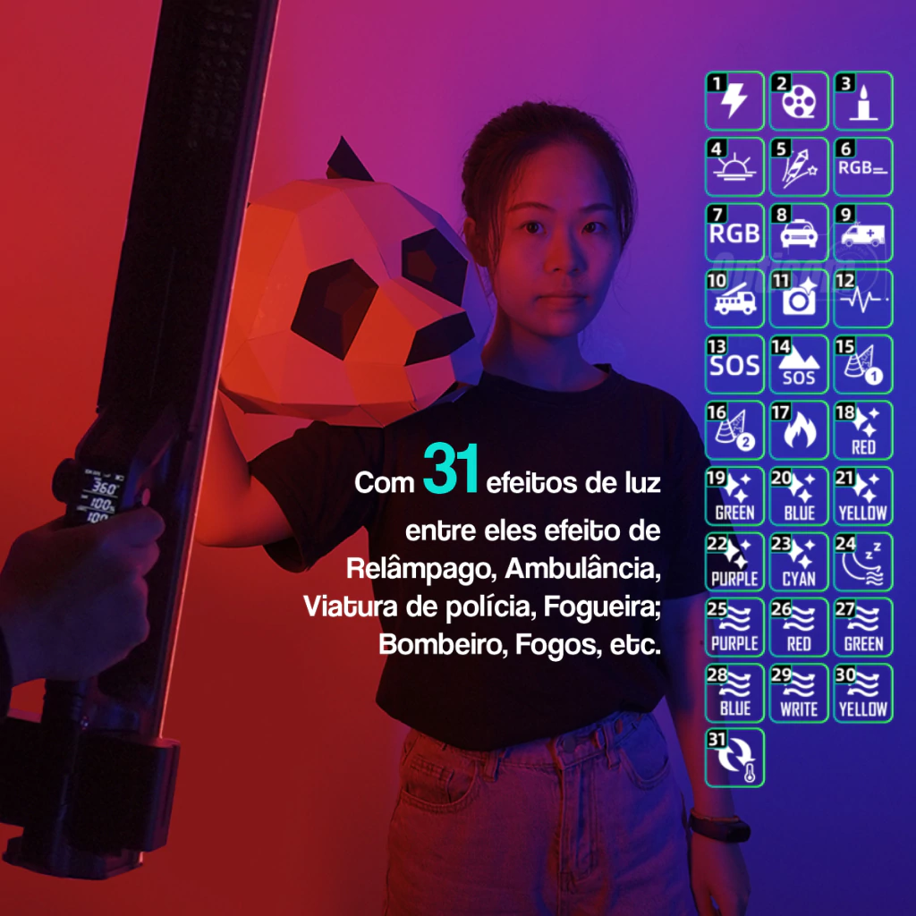 Ele conta com 31 efeitos de luz, ajuste fino de cor e intensidade da luz.