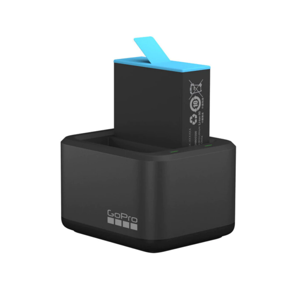 O kit Carregador de bateria duplo GoPro + bateria para HERO 9/10 Black inclui uma bateria de 1720mAh e possui um carregador com capacidade de carregamento simultâneo de até duas baterias.