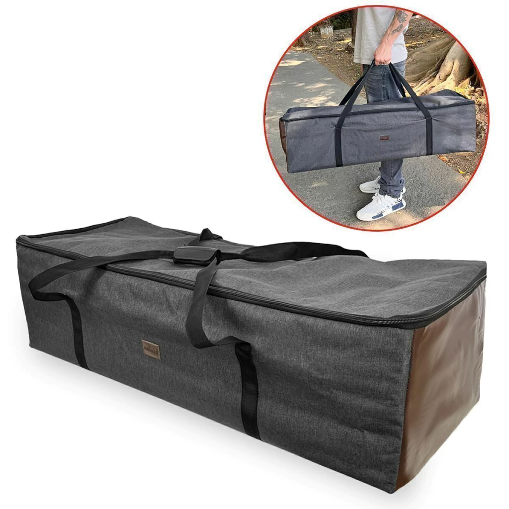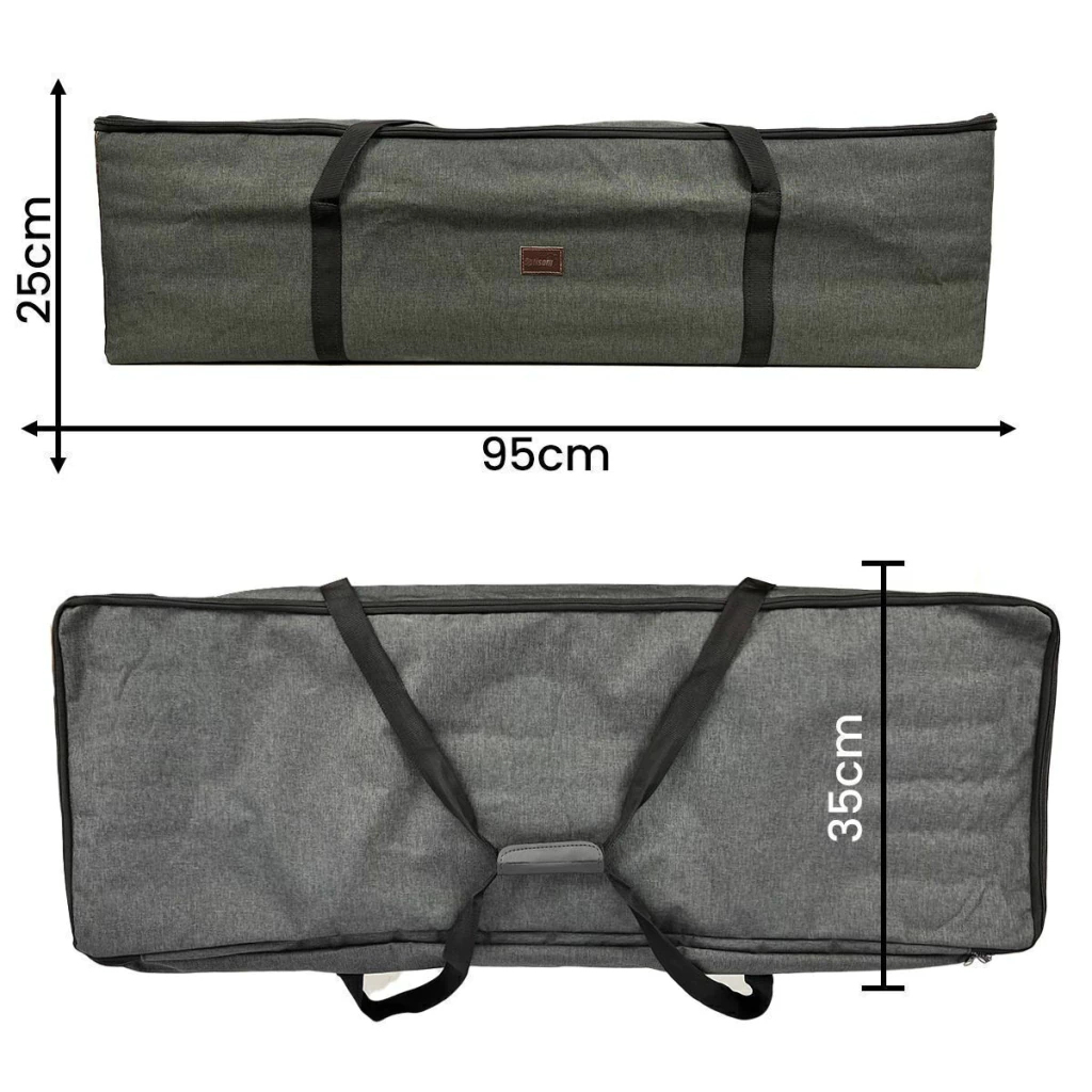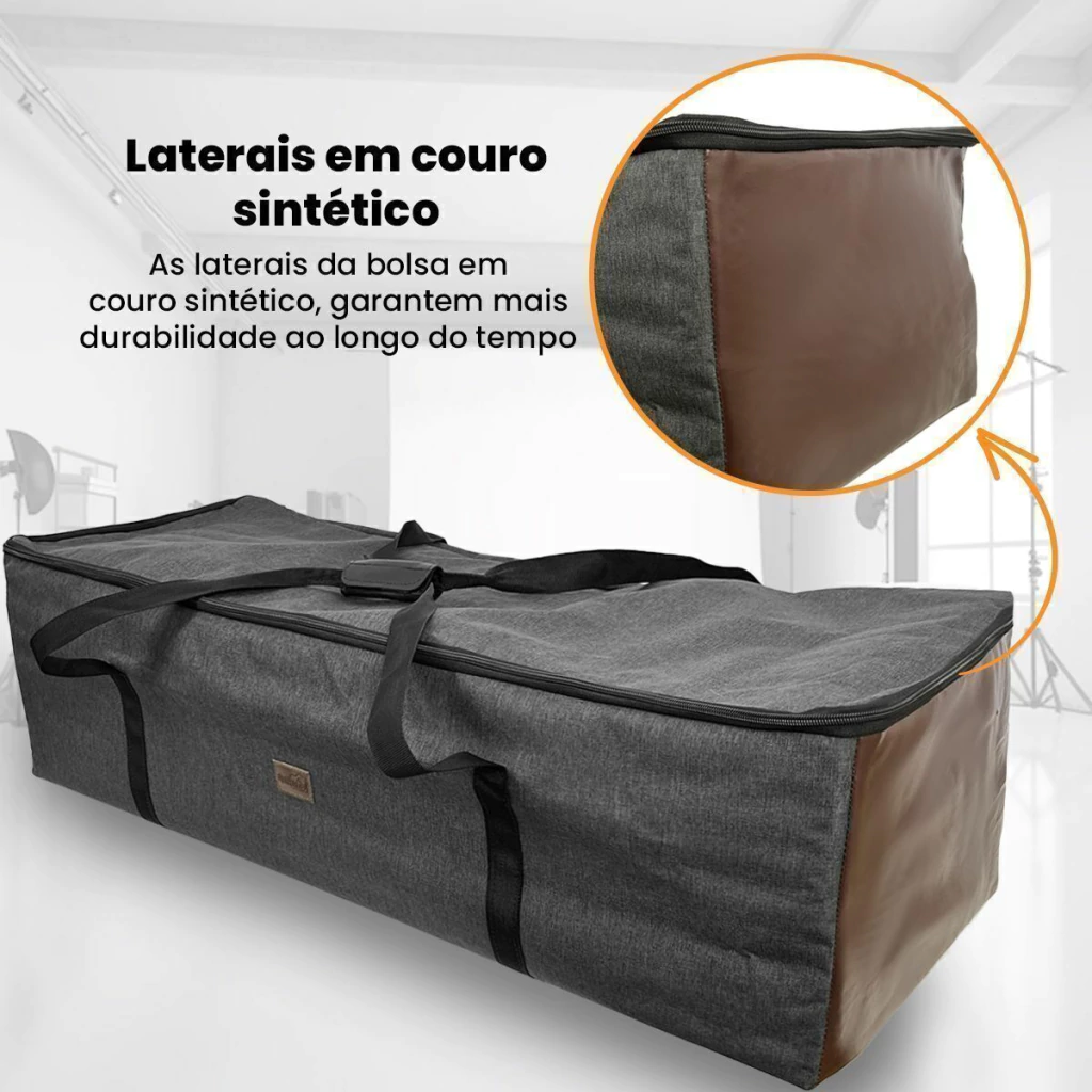 A bolsa suporta equipamentos de até 95cm de comprimento, 35cm de largura e 25cm de altura.
