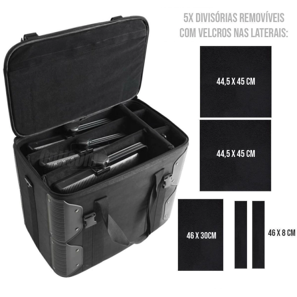 Além de toda proteção nas paredes o case conta com 5 divisórias para acomodar todos equipamentos com muita proteção e sem arranhões.