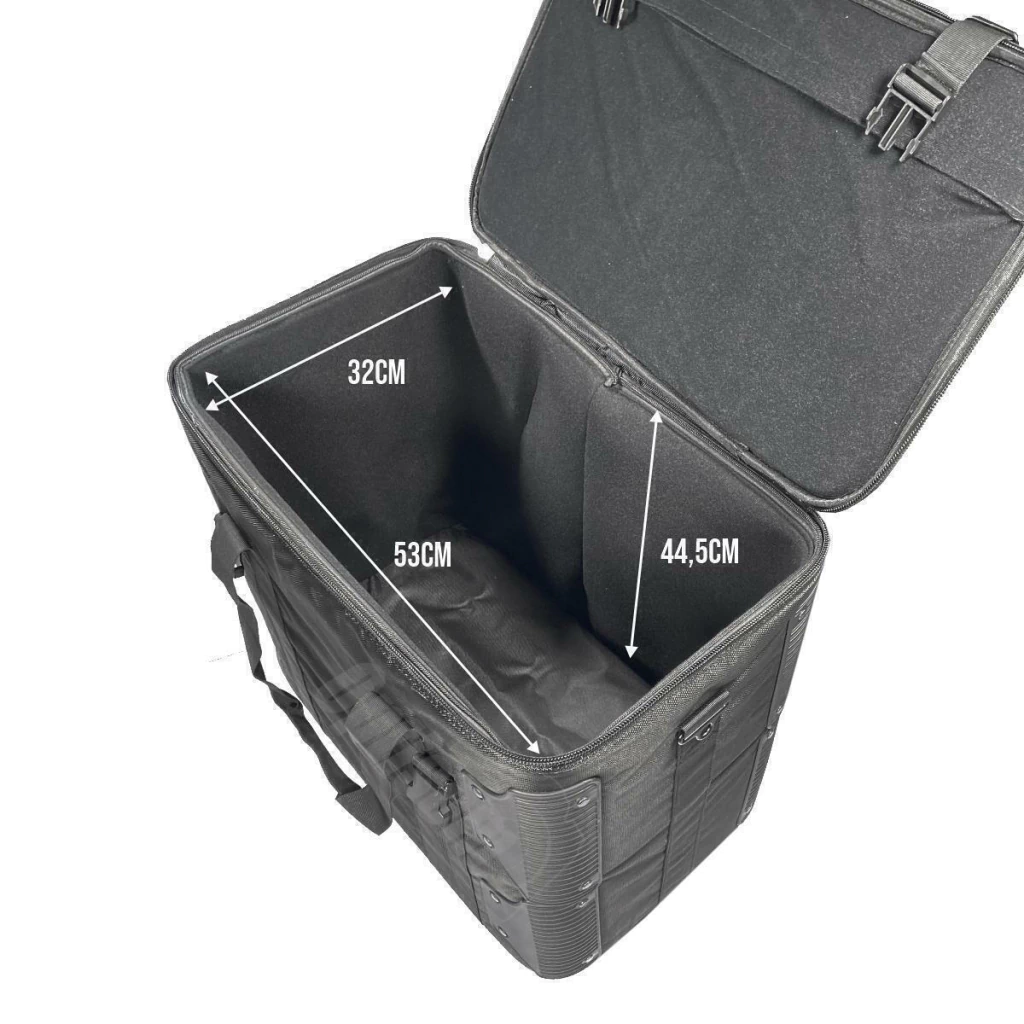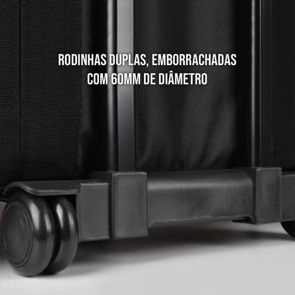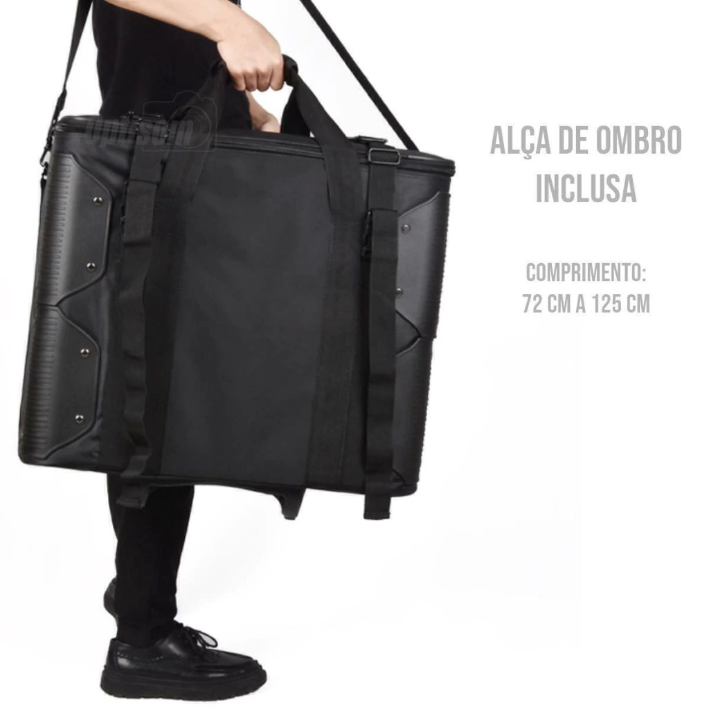 Case muito espaçoso e altamente resistente com paredes acolchoadas e revestidas a fim de proteger contra impactos e riscos.