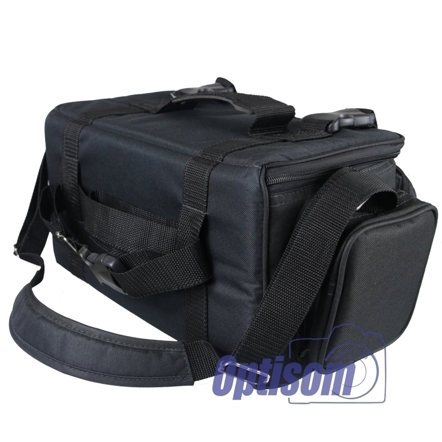Acomoda equipamentos e acessórios na parte principal central. Bolso com zíper menor na parte frontal . Dois bolsos simples menores com zíper nas laterais Alça de mão e tira colo. Modelo cabe perfeitamente na bagagem de mãos de todas aeronaves de voos comerciais Cor do tecido externo preto