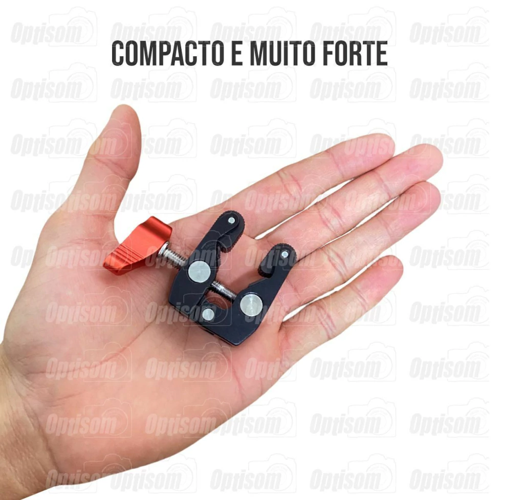 Esse super clamp Greika Fixa em tubos e em superfícies retas como mesa, armários, tripés, entre outros lugares.
