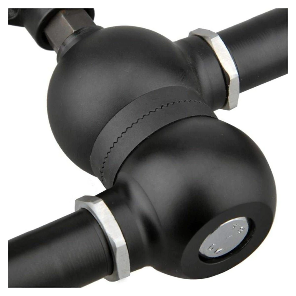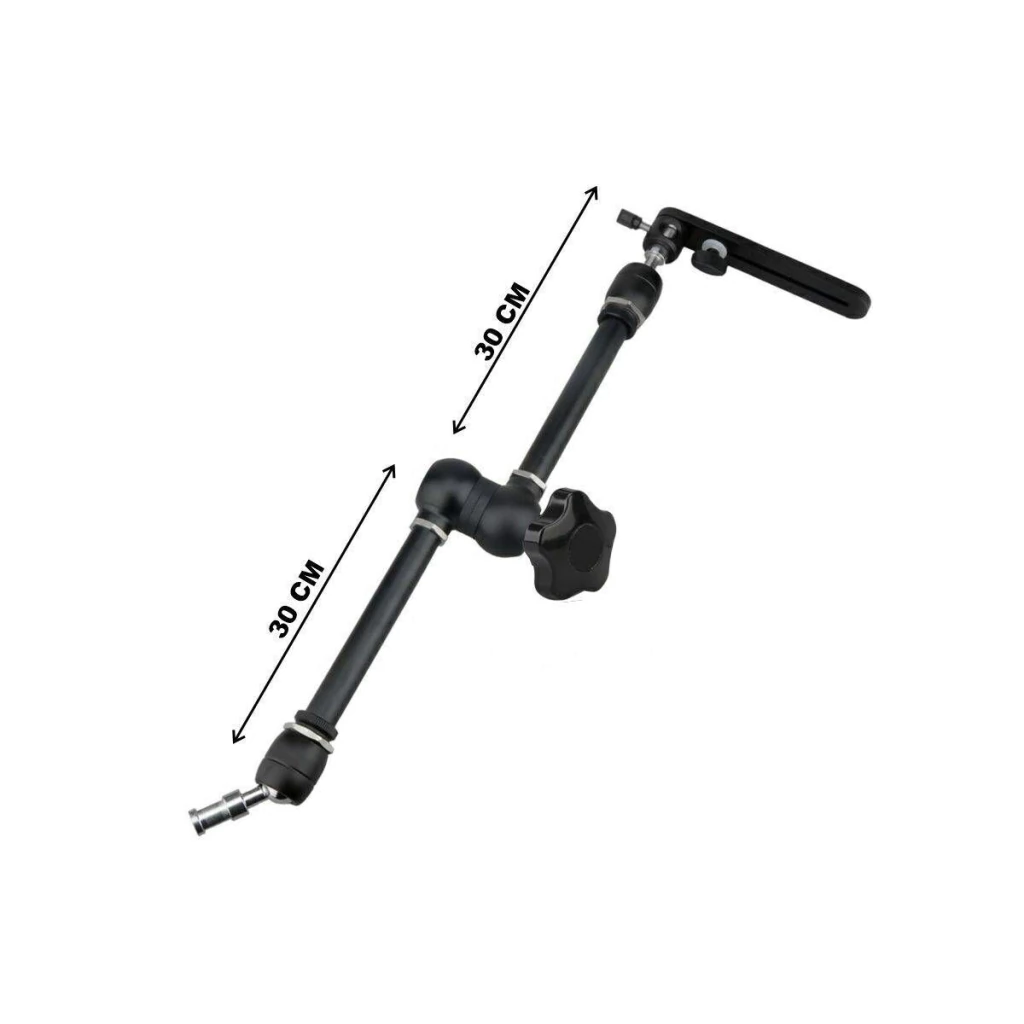 Possui articulações com rotação de 360° nas extremidades e 90° nas juntas, permitindo ajustes precisos em diversas posições. A manopla central controla simultaneamente todos os pontos de articulação, garantindo praticidade no travamento e estabilidade no uso.