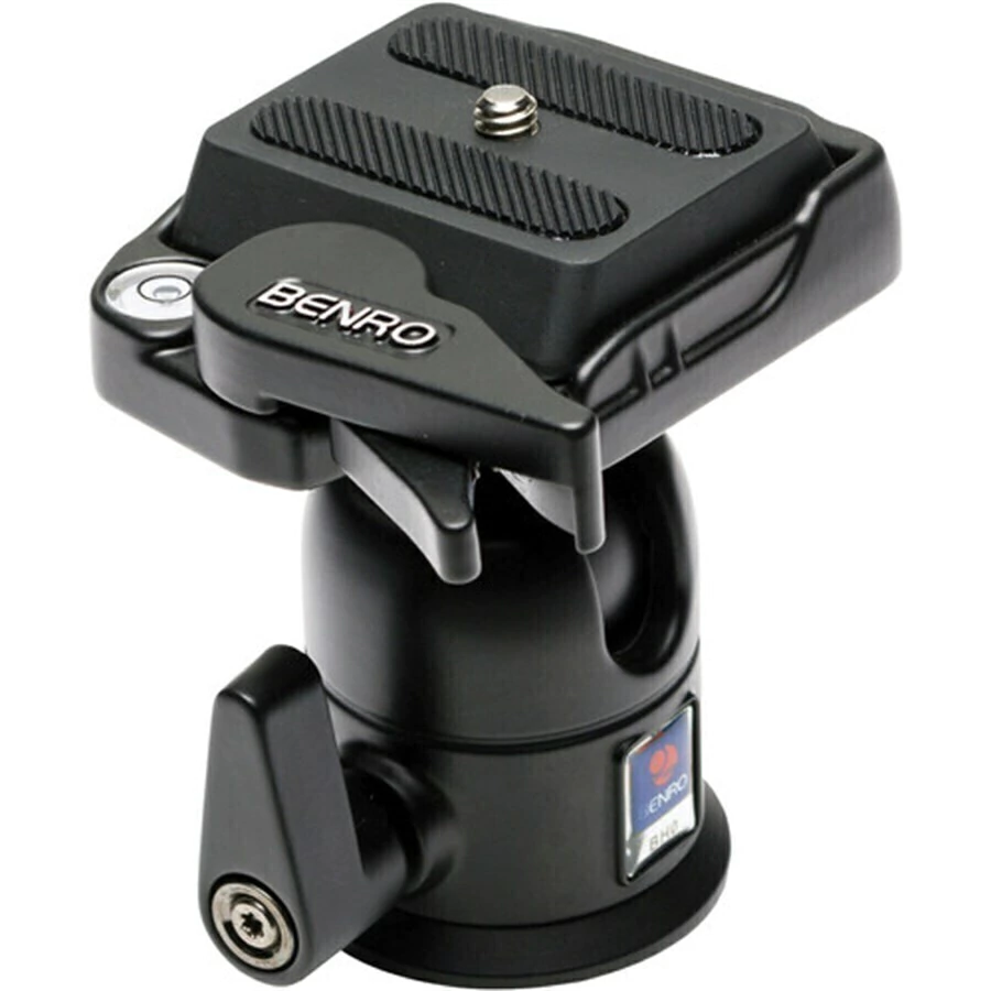 Cabeça BallHead Benro BH0, versátil, pequena e leve, base da cabeça tipo bola o que permite uma ótima articulação e trava única, engate rápido firme e trava de segurança para libera-lo, na parte superior da cabeça possui nível bolha para um ajuste preciso do ângulo.