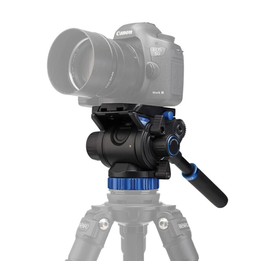 O Benro S7 cabeça de vídeo profissional suporta plataformas de câmera com peso até 7kg e está equipada com uma base plana para anexar diretamente em tripés, monopés, sliders, e outros equipamentos de suporte de câmera com um pino de 3/8".