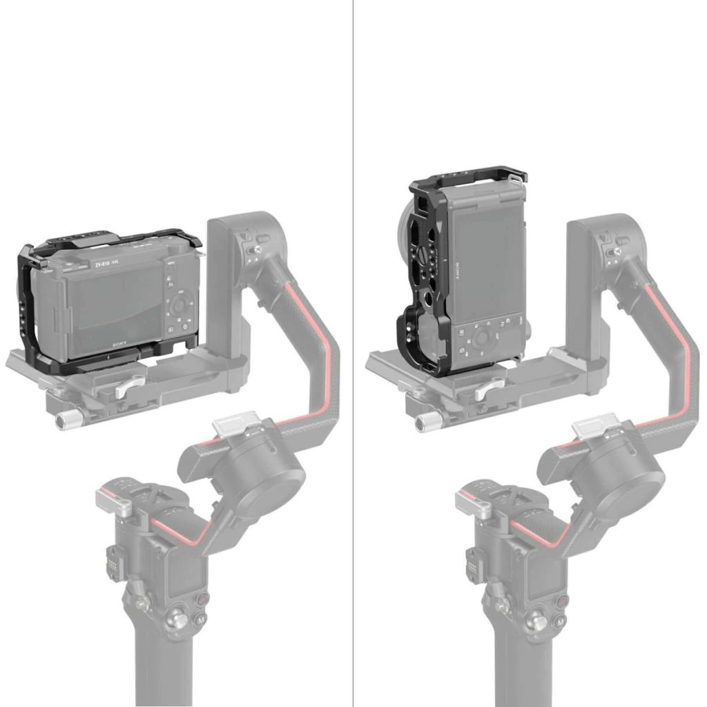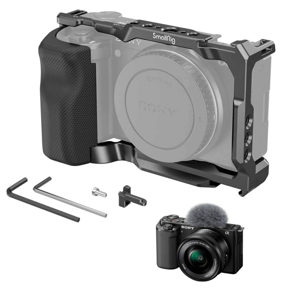 Gaiola Cage de câmera SmallRig para Sony ZV-E10 3538B é uma gaiola completa, com empunhadura, projetada para fornecer proteção e montagens de acessórios para sua câmera.