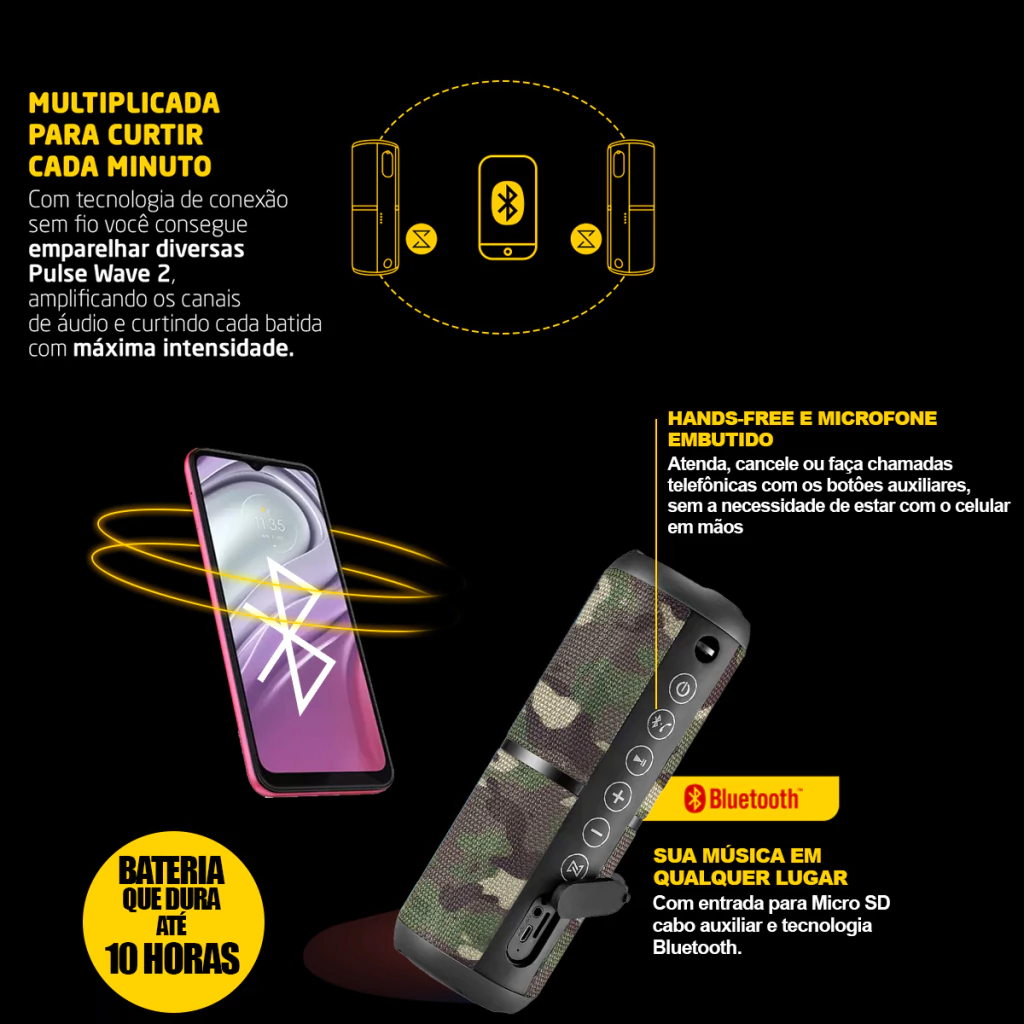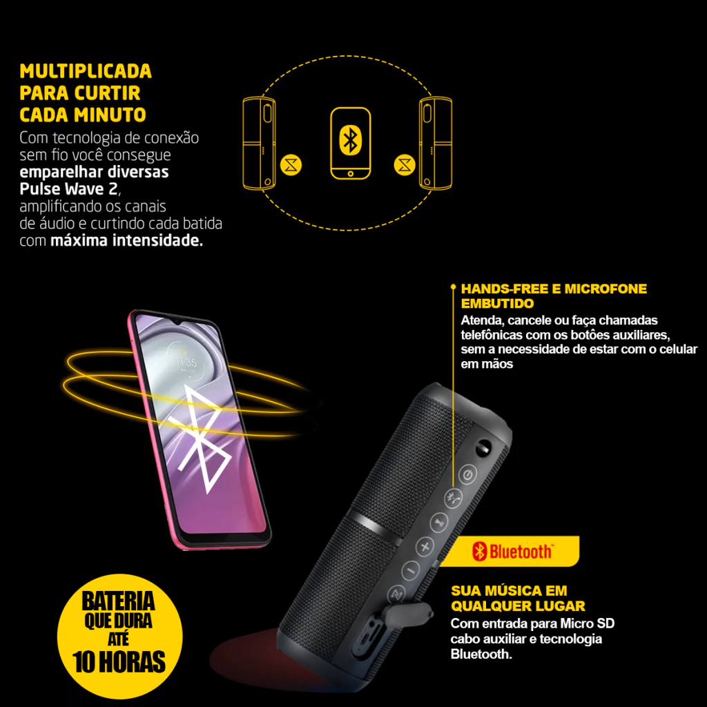 A Pulse Wave 2 também conta com a tecnologia TWS (True Wireless Stereo), você consegue emparelhar diversas Pulse Wave 2 e intensificar ainda mais cada batida da sua música favorita.