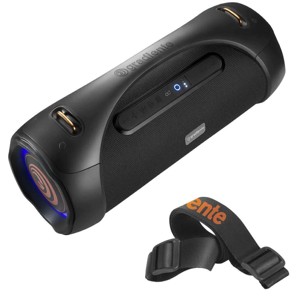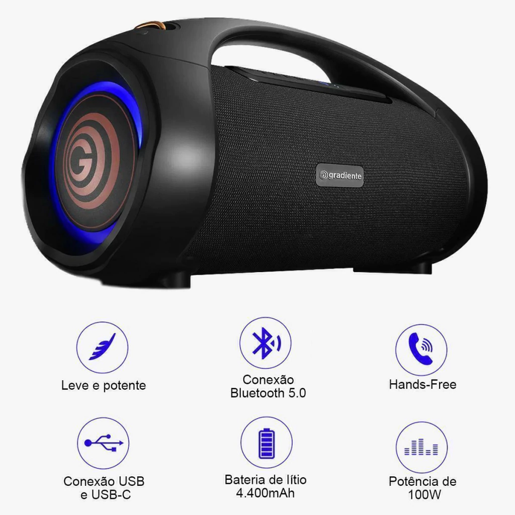 A caixa de som Boombox Intense da Gradiente, possui 100W de potência com autonomia da bateria de até 4 horas no volume máximo!