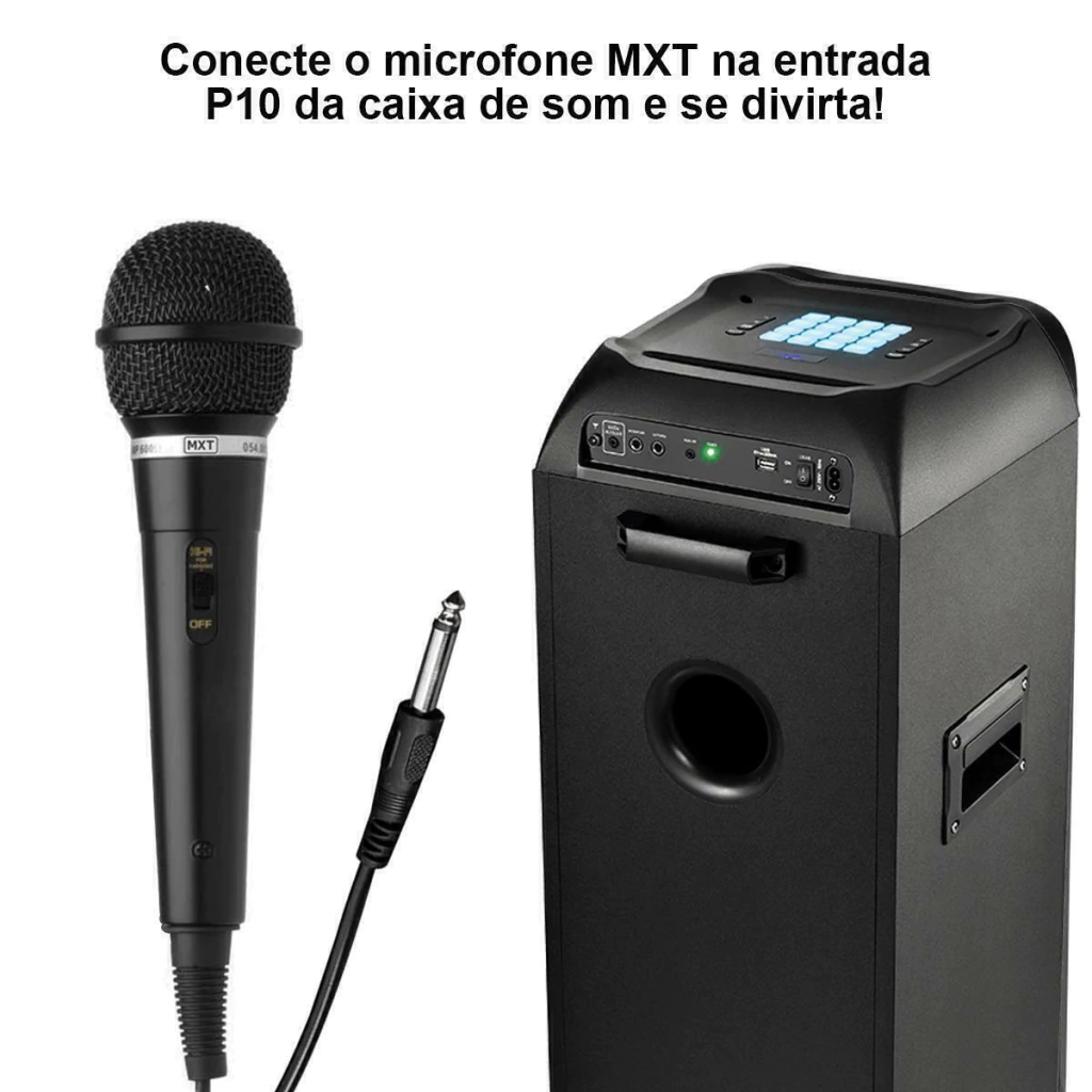 Basta apenas conectar o microfone de mão na entrada P10 da caixa e já está pronto para uso.