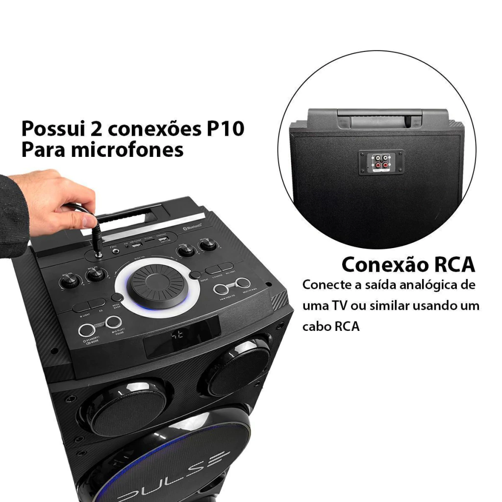CONECTIVIDADE - Ouça sua playlist através da conexão Bluetooth, USB, cartão de memória, entrada auxiliar P2 3,5mm, RCA, TWS além de possuir 2