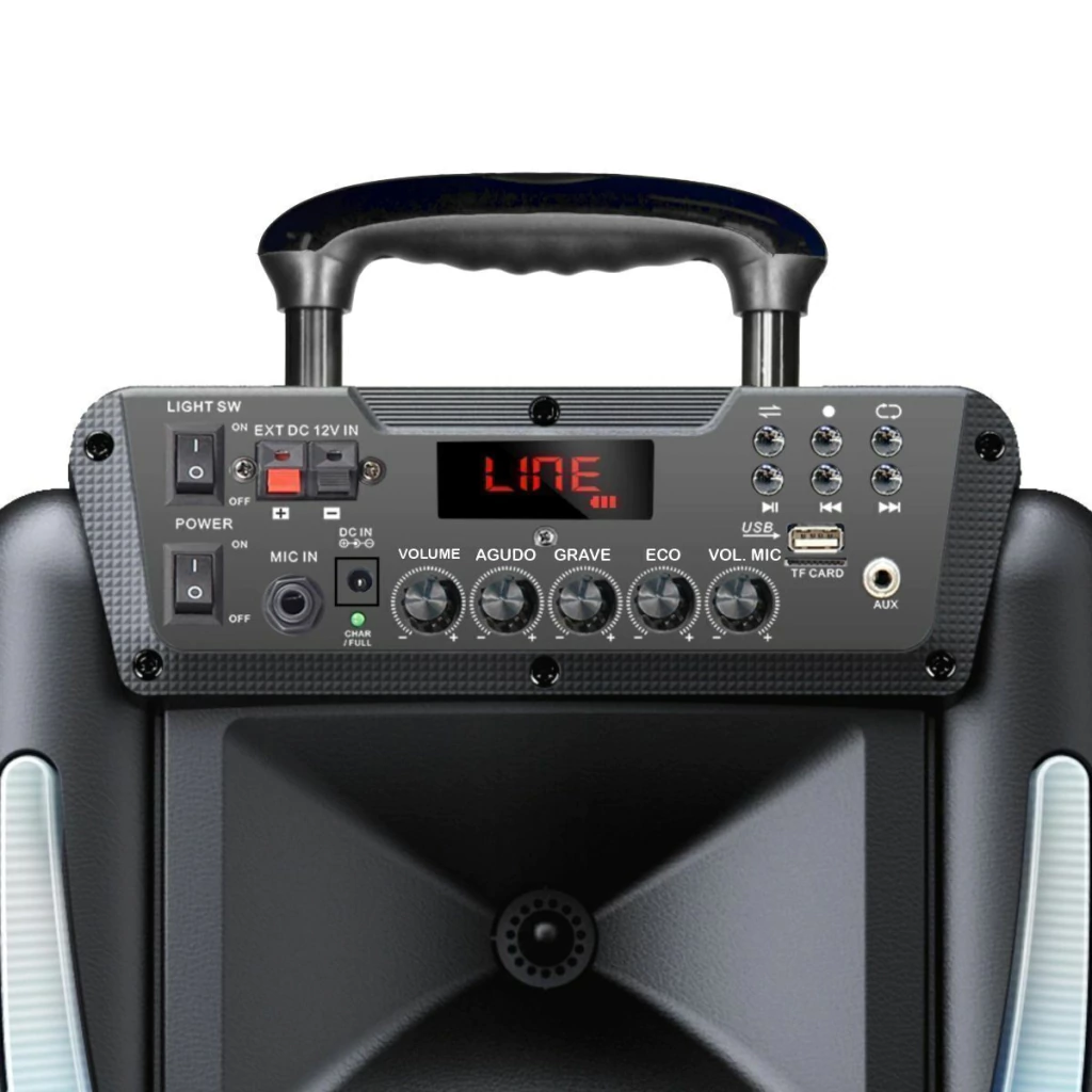 Leve essa caixa de som para onde quiser! Conte com a alça retrátil, suas rodinhas e a bateria recarregável.