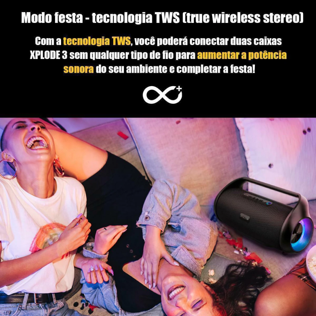 Modo Festa - Tecnologia TWS (True Wireless Stereo): Com a tecnologia TWS, você poderá conectar duas caixas de som XPLODE 3 sem qualquer tipo de fio para aumentar a potencia sonora do seu ambiente e completar a festa!