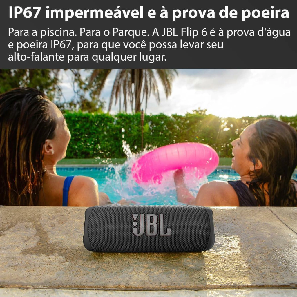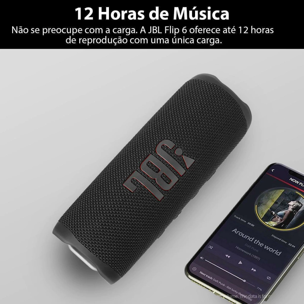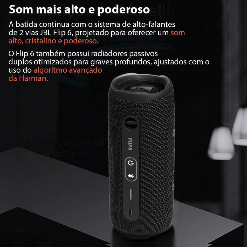 Sua aventura. Sua trilha sonora. O arrojado JBL Flip 6 oferece o poderoso som JBL Original Pro com clareza excepcional graças ao seu sistema de alto-falantes de 2 vias que consiste em um driver otimizado em forma de pista de corrida, tweeter separado e radiadores de graves duplos.