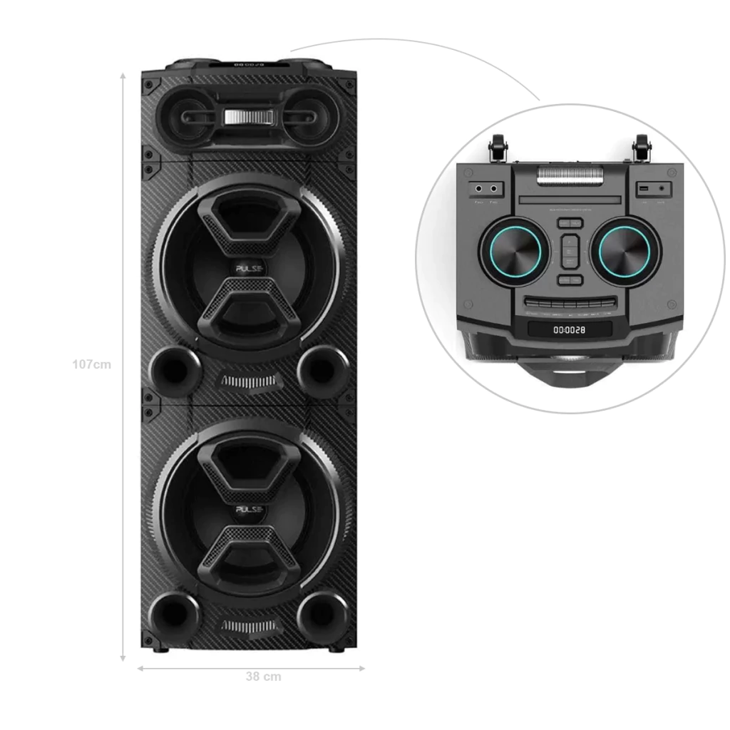 1.700W de potência em 2 alto-falantes de 10 polegadas + 2 tweeters que trazem alta fidelidade ao som.