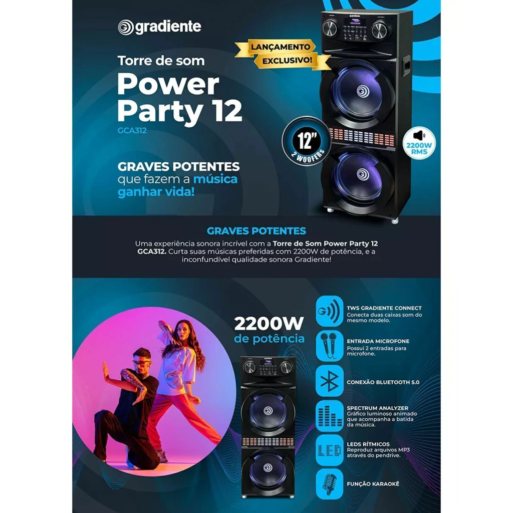 Possui 2 woofers de 12 polegadas e a Função Gradiente Connect que permite a conexão entre 2 torres do mesmo modelo para aumentar a potência do som, proporcionando um efeito estereofônico incrível.