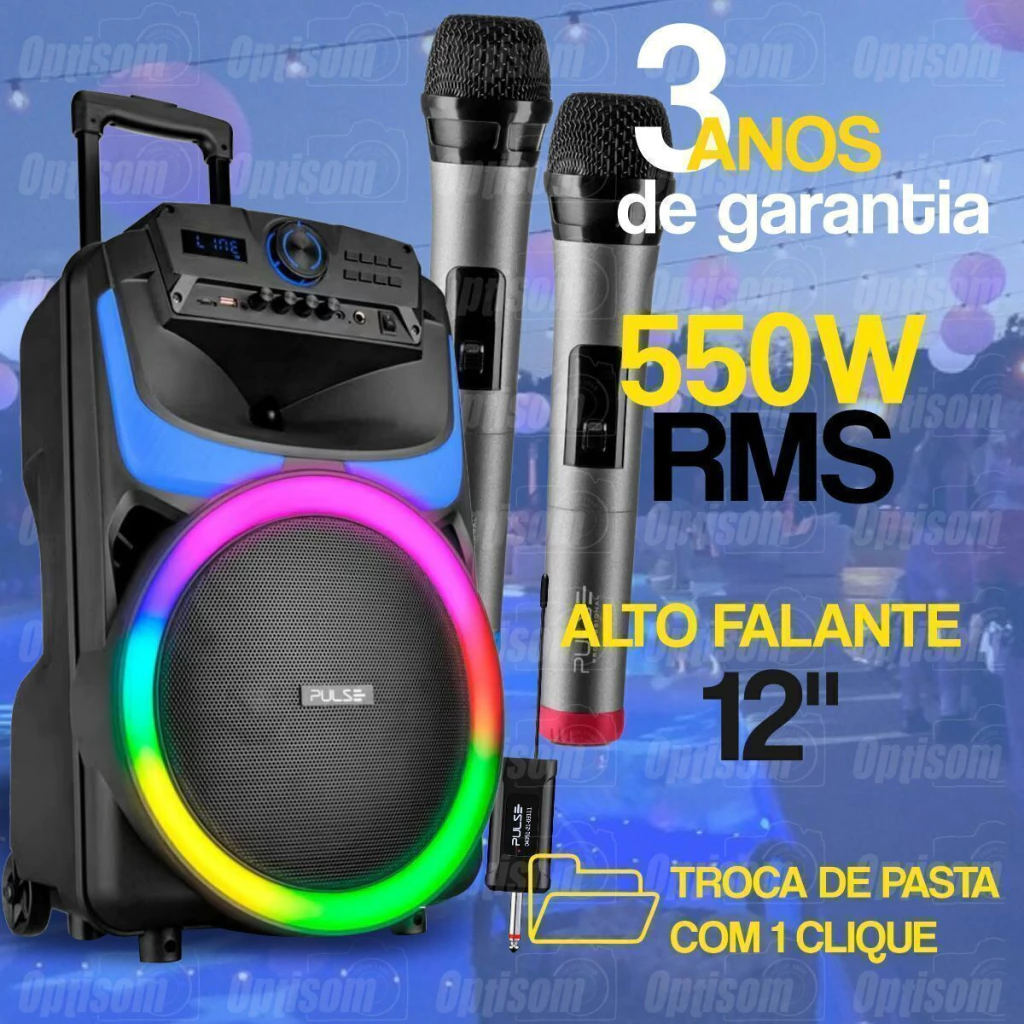 Caixa de Som Amplificada com rodinhas Pulse BURST 550W RMS SP403E luzes RGB, com BATERIA de 14H de DURAÇÃO, Bluetooth, Rádio FM, entrada AUX P2, entrada de Pen Drive, Cartão Micro SD e também de microfone P10.