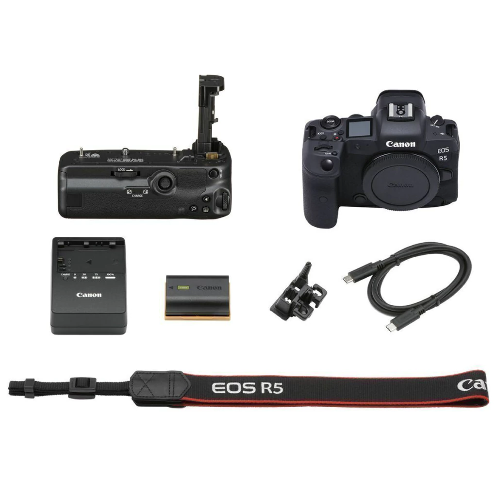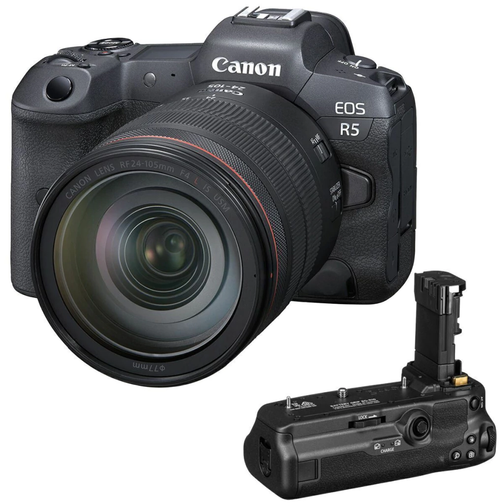 O kit de câmera Canon EOS R5 com lente 24-105mm f/4L e grip BGR10 original é uma combinação poderosa para fotografia profissional.