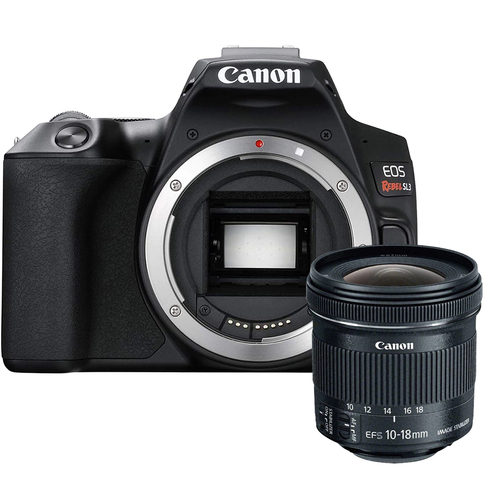 Canon EOS Rebel SL3 preta é uma DSLR versátil que oferece uma combinação ideal de fotos e recursos de vídeo.