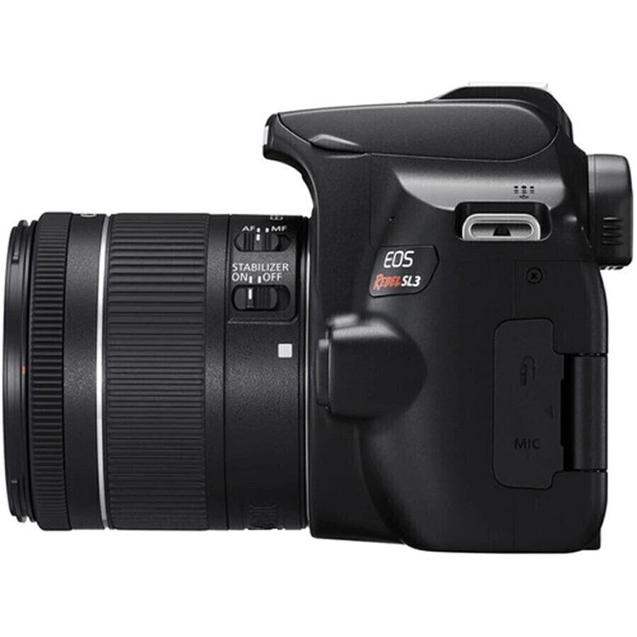Canon EOS Rebel SL3 preta é uma DSLR versátil que oferece uma combinação ideal de fotos e recursos de vídeo.