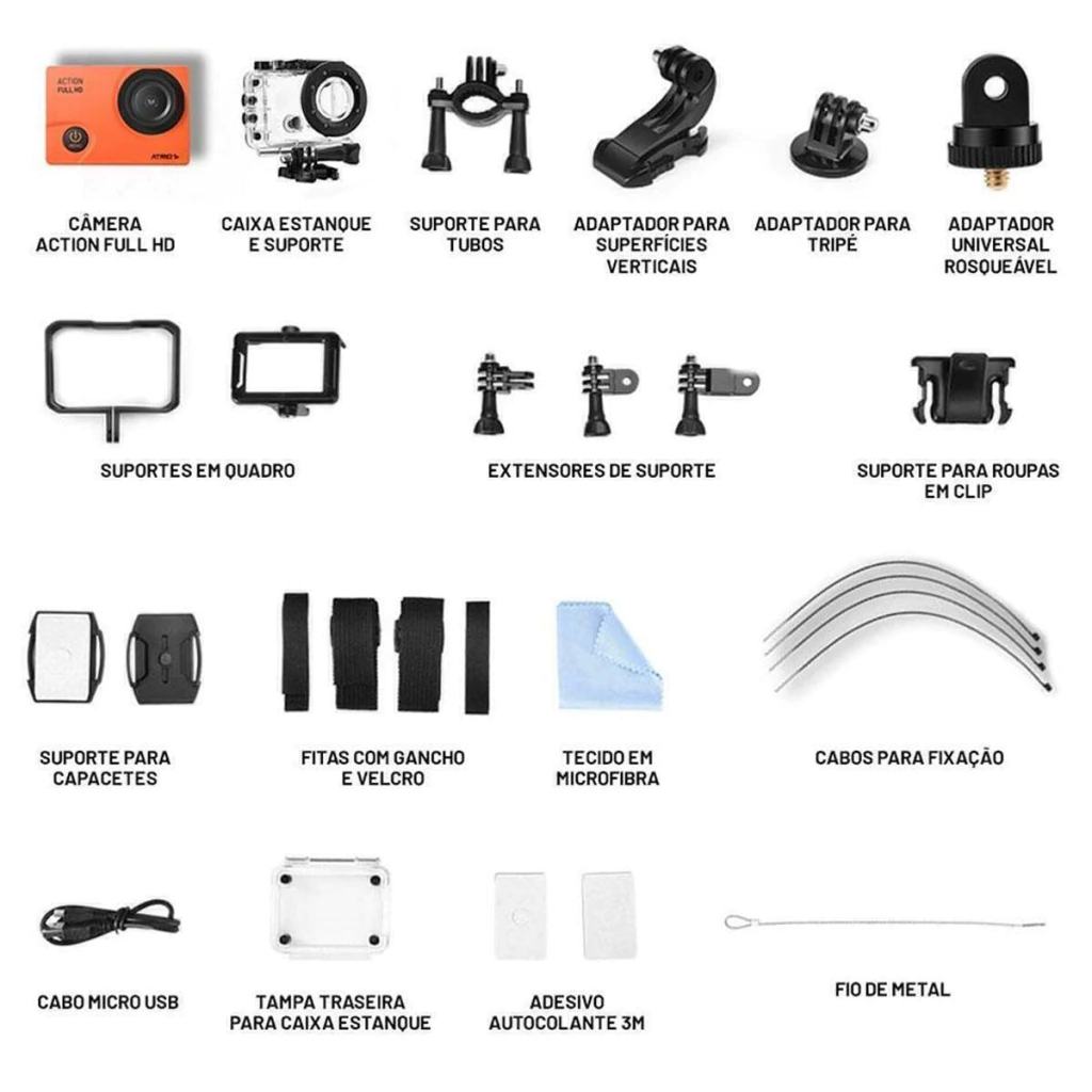 Já incluso diversos acessórios que você pode usar a câmera no capacete, guidão, prancha, skate e entre outros.