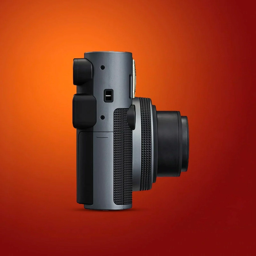 O design da câmera também possui um visor de janela clássico para enquadrar facilmente o seu objeto, bem como um acabamento metálico sutil com detalhes em laranja.