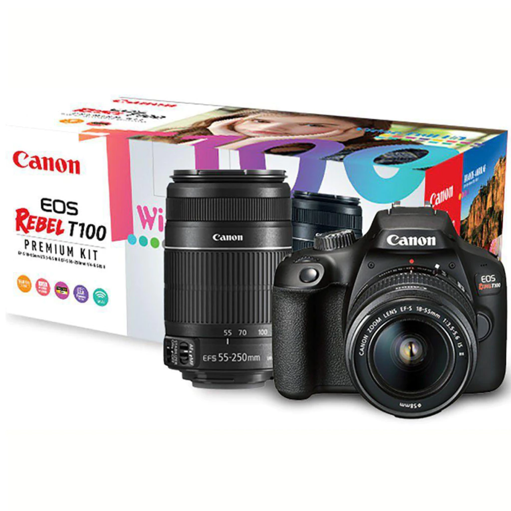 Junto com a Canon T100 está uma lente Canon 18-55mm F/3.5-5.6 III + 55-250mm F/4-5.6 IS II que permite fotografar eventos, retratos, telefoto, natureza, etc.