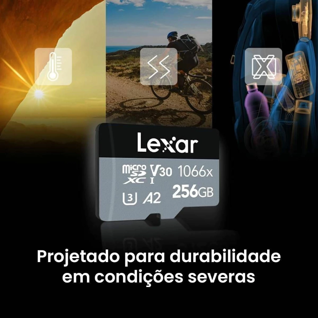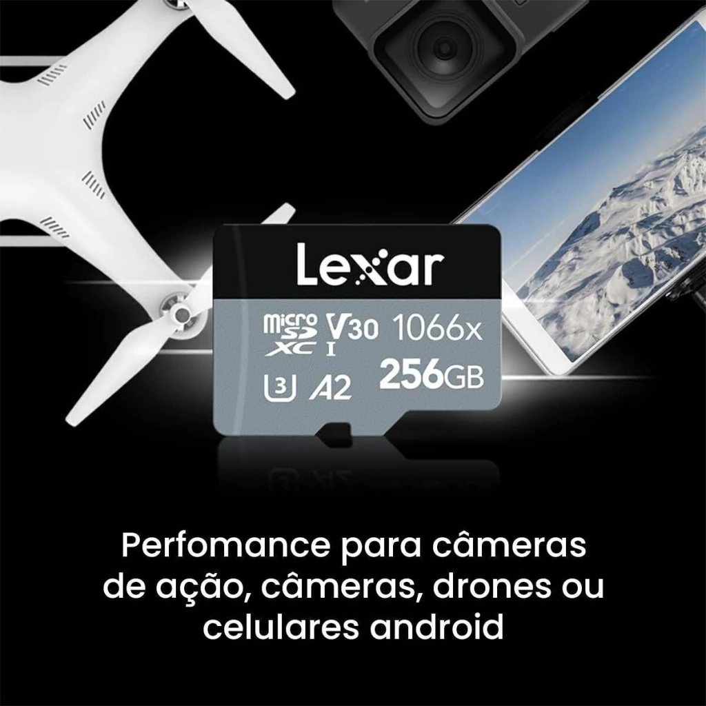 Projetado para câmeras de ação, drones e smartphones Android, o cartão de memória microSDXC Professional 1066x UHS-I de 256 GB da Lexar possui capacidade de armazenamento de 256 GB e suporta velocidades máximas de leitura de até 160 MB/s e velocidades máximas de gravação de até 120 MB /s.