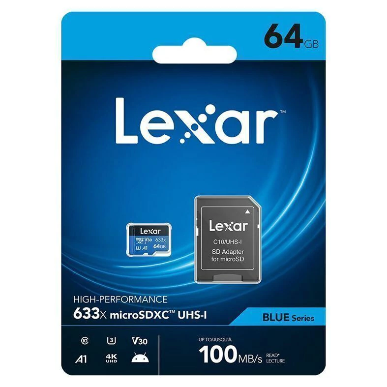 O cartão de memória microSD da Lexar suporta uma velocidade máxima de leitura de 100 MB/s e é capaz de armazenar até 36 horas de vídeo, 67.600 fotos ou 58.100 músicas.