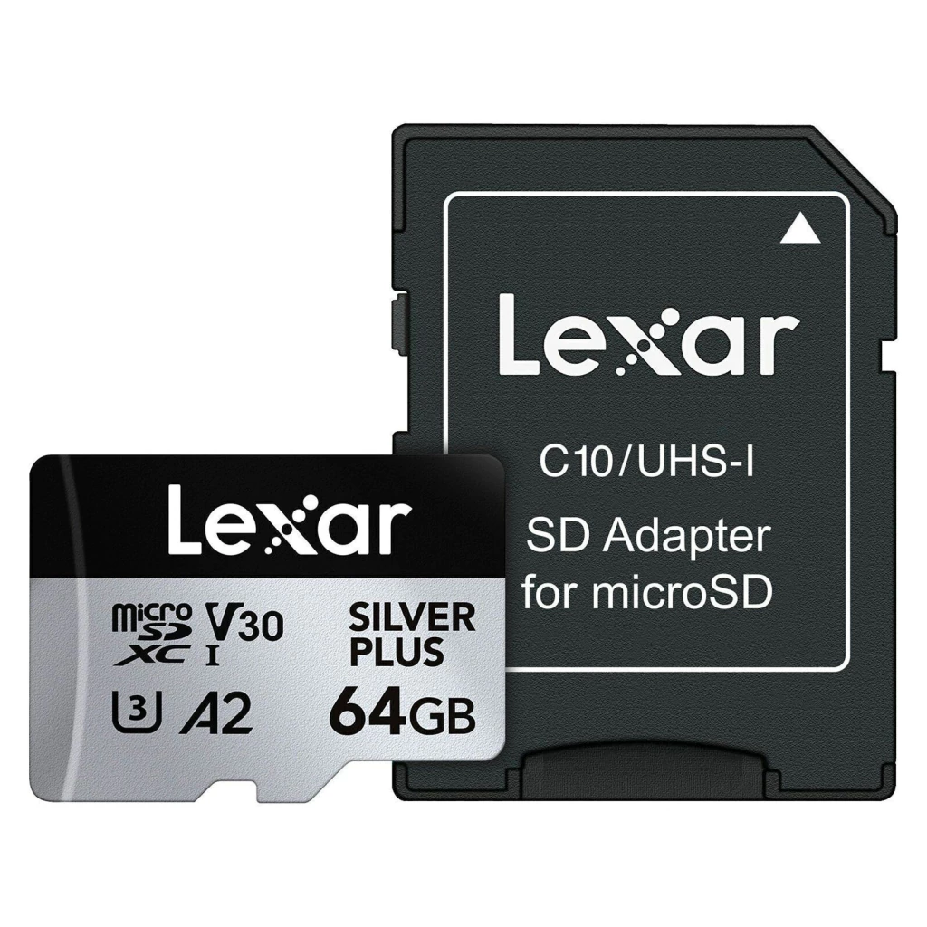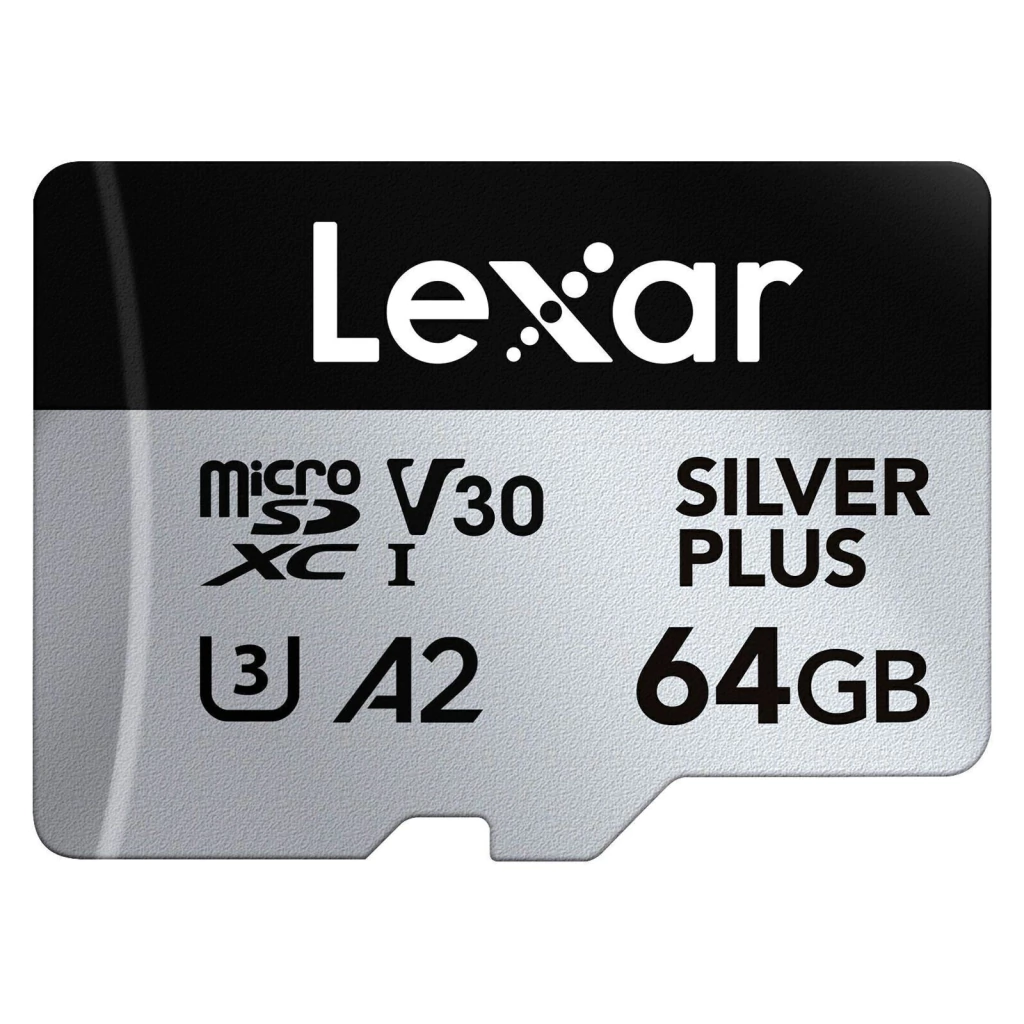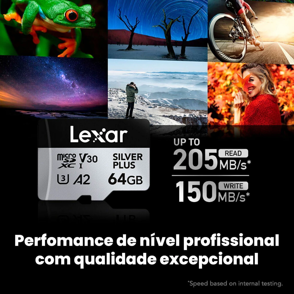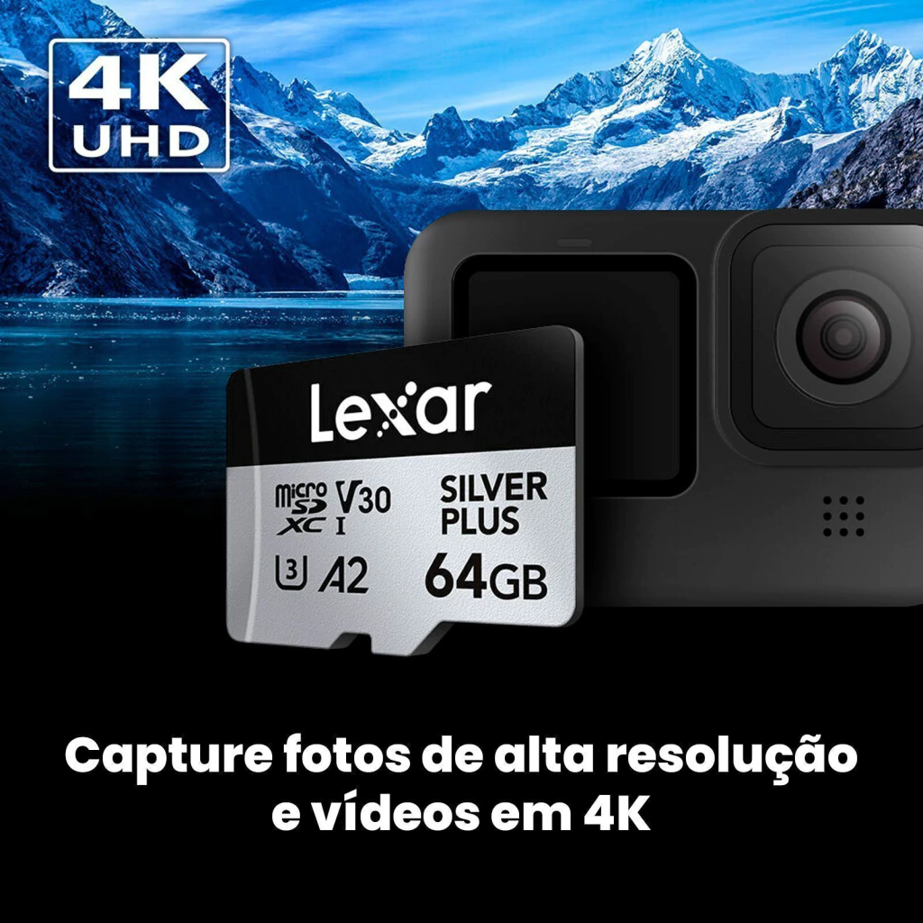 O Cartão de Memória MicroSDXC UHS-I Profissional SILVER PLUS de 64 GB da Lexar possui capacidade de armazenamento de 64 GB e utiliza o barramento UHS-I para suportar vídeos em Full HD e 4K/60p.