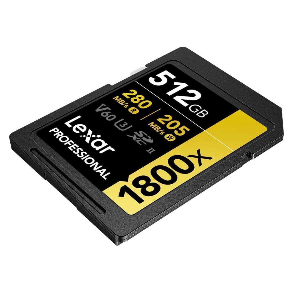 O cartão de memória SDXC UHS-II profissional 1800x de 512 GB (série GOLD) da Lexar possui uma capacidade de armazenamento de 512 GB e aproveita o barramento UHS-II para oferecer suporte a funções DSLR avançadas, como disparos contínuos e disparos rápidos, bem como capturas raw e JPEG.