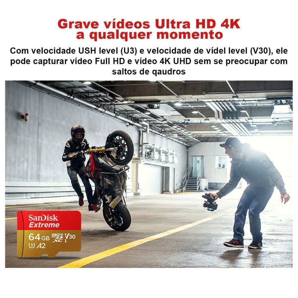 Projetado para dispositivos microSD, como smartphones, drones ou câmeras de ação que podem capturar vídeo Full HD, 3D e 4K, bem como fotografia raw e burst, o cartão de memória Extreme UHS-I microSDXC de 64 GB da SanDisk tem capacidade de 64 GB, é compatível com o barramento UHS-I e possui uma classificação de classe de velocidade de V30, que garante velocidades mínimas de gravação de 30 MB/s.