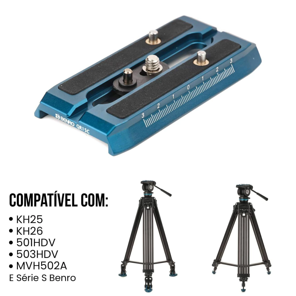 A placa QR15C é compatível com os cabeçotes Manfrotto 501HDV, 503HDV, 701HDV e MVH502A, juntamente com os grampos de liberação rápida da Série S da Benro.