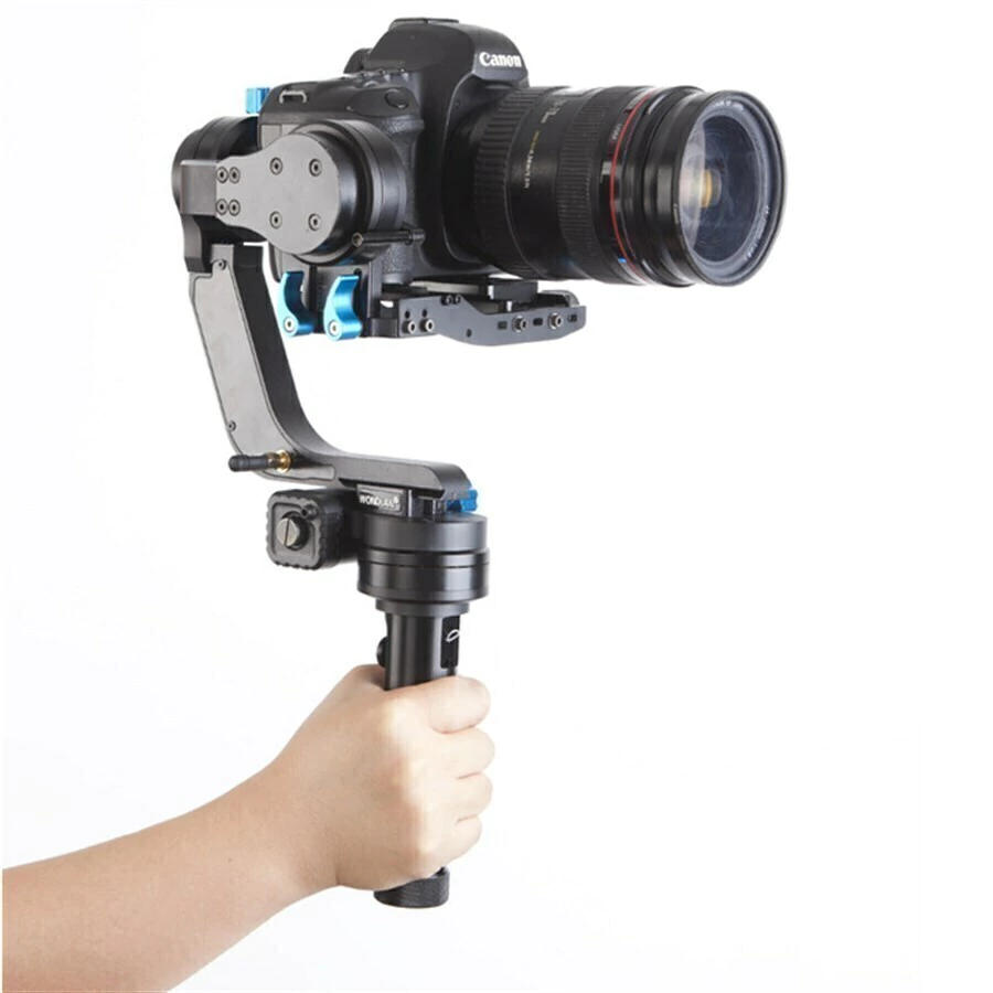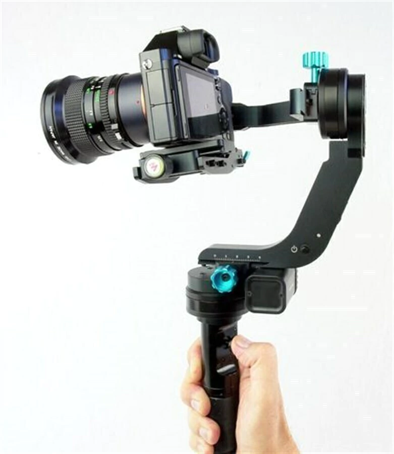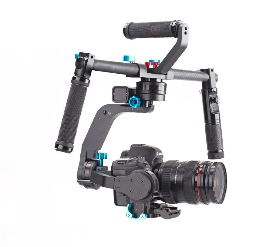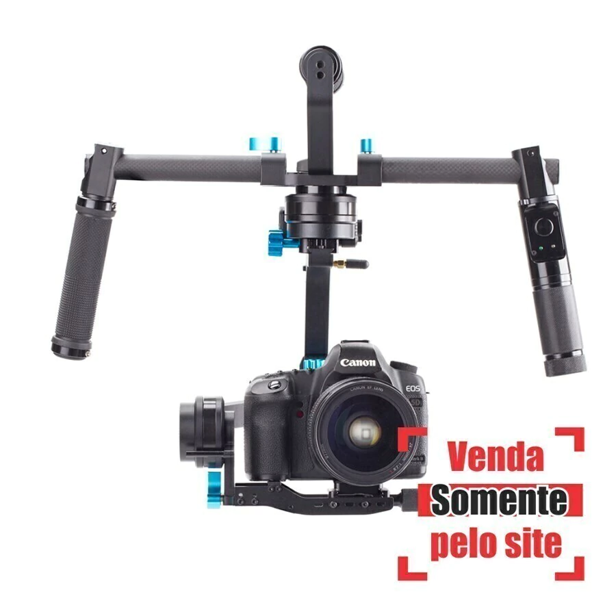 Estabilizador gimball de câmera de 3 eixos garante 100% de estabilidade em suas imagens. Ele pode ser montado de cinco maneiras diferentes deixando-o com uma pegada mais firme ou mais compacto, pode ser controlado por um joystick sem fio regulando os movimentos pan (esqueda-direita) e movimento tilt (cima-baixo).