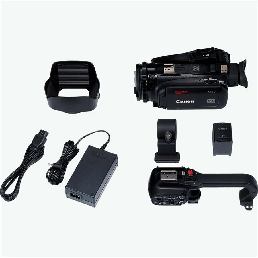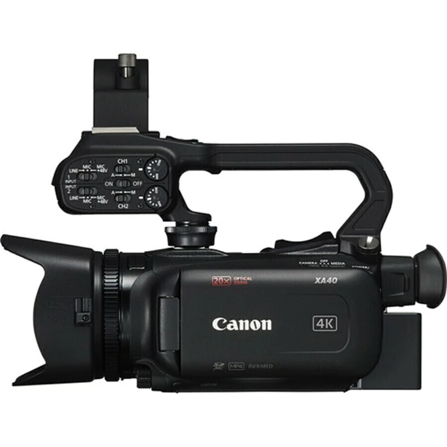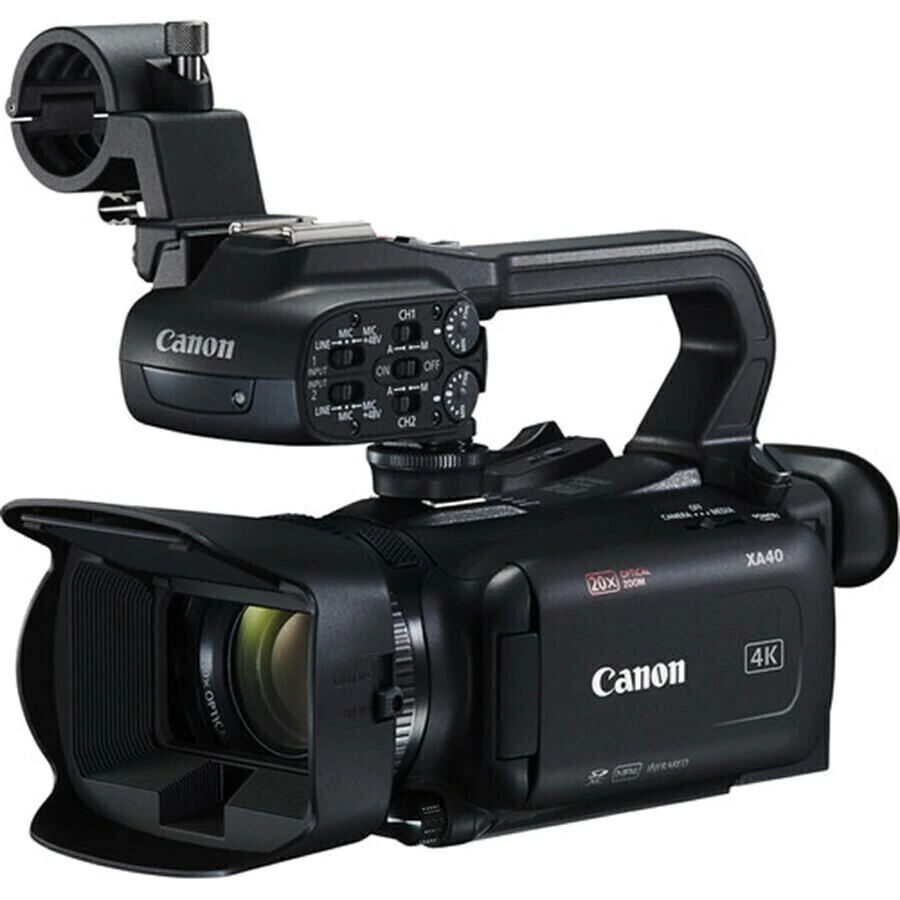 A Camcorder Canon XA40 Professional UHD 4K é uma câmera compacta e leve com captura UHD 4K, um sensor CMOS de 1 / 2,3", duas entradas de áudio XLR e uma saída mini-HDMI que se encaixa na categoria ENG para documentário ou jornalismo produções.