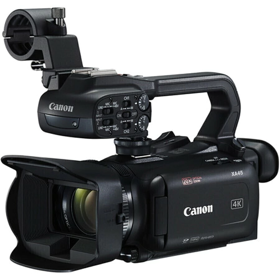 A Camcorder Canon XA45 Professional UHD 4K é uma câmera compacta e leve com captura UHD 4K, um sensor CMOS de 1 / 2,3", duas entradas de áudio XLR e uma saída mini-HDMI que se encaixa na categoria ENG para documentário ou jornalismo produções.