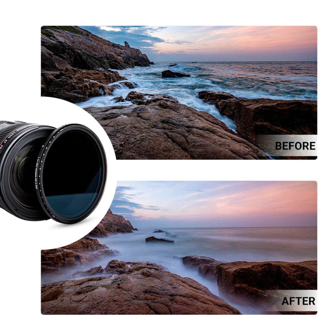 Este filtro apresenta um elemento de rotação da frontal, que altera a densidade do filtro, para ajudar a reduzir a quantidade de luz que entra na lente da câmera.