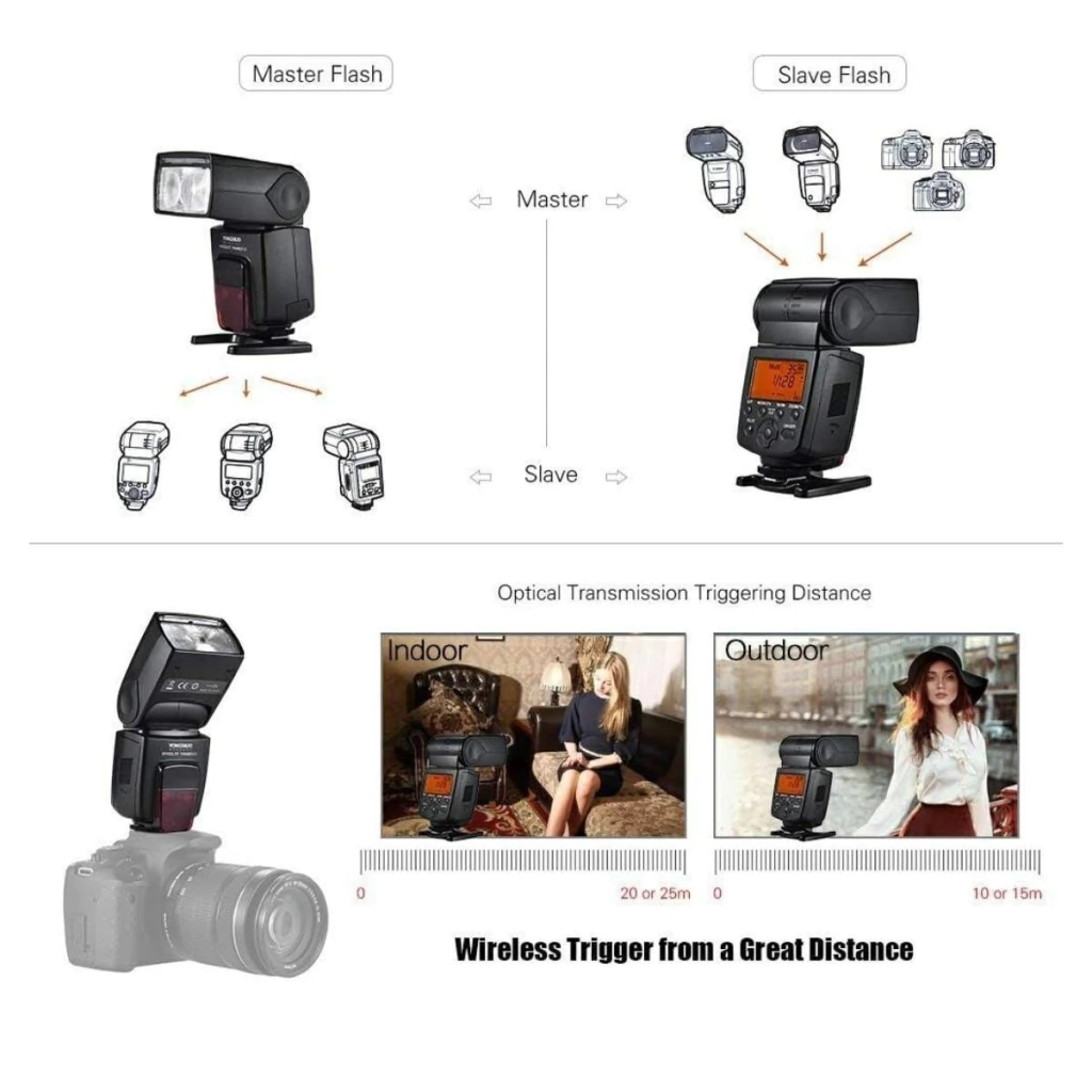 Sistema slave disparo sem fio é compatível com os flashs Nikon e Canon, é capaz de aceitar respectivamente 580EX II, SB-900/800/700, 7D/60D/600D, C ordem de piscar interna N e ST-E2 sinal sem fio, alcança externo TTL e piscando manuais. Algumas funções acenando, como wireless TTL piscando, piscando agrupamento relação de luz TTL ea iluminação do remotas piscando controlados podem ser facilmente alcançada apenas se você levar uma câmera com built-in piscar sistema de comando e YN568EX.