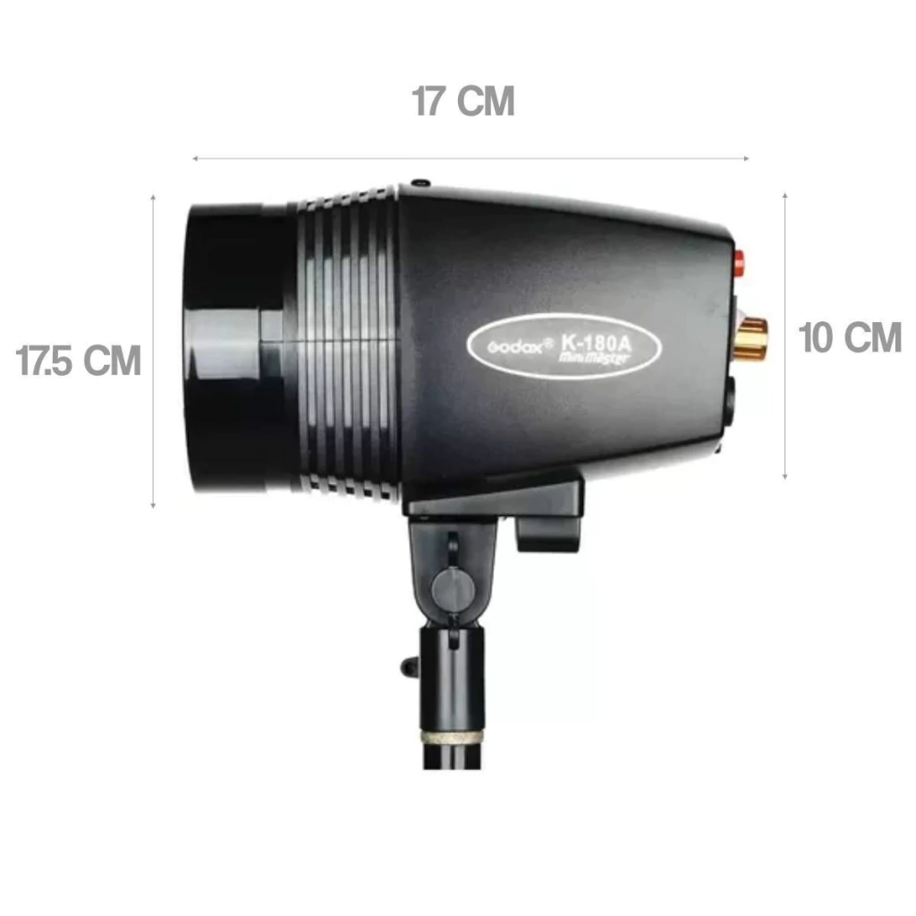 Flash de estúdio K180A da Greika, é um flash tipo tocha com um potencia máxima de 150 watts e esta carga pode ser ajustada de 1/1 a 1/8, possui fotocélula e uma lâmpada de xênon modeladora de 75 watts.