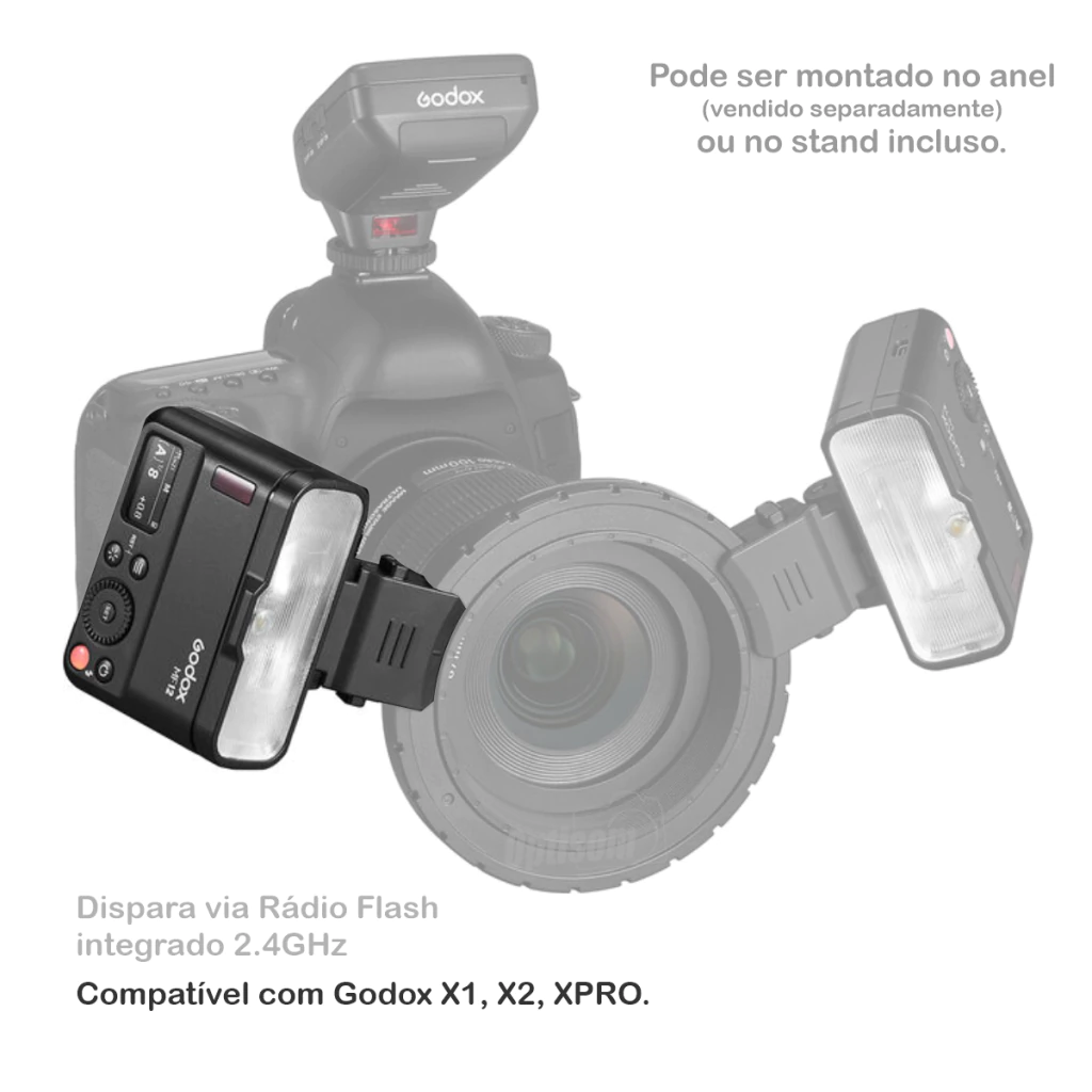 Flash GODOX Macro MF12 com rádio flash 2.4Ghz Embutido e luz de modelagem, compatível com todas câmeras equipadas com transmissor Godox X1, X2 ou XPRO.