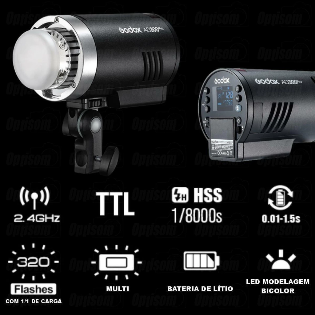 Sincronismo: Conector P2 de sincronismo ou Via Rádio Flash Godox 2.4G