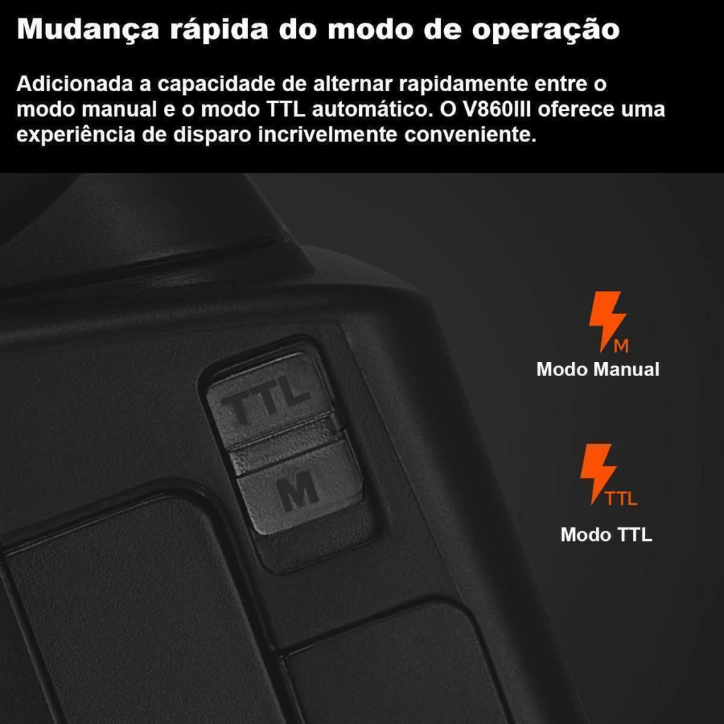 Flash GODOX VING V860III S TTL para câmeras Sony como A6300, A6400, A6500, A7III, A7R, A7S, A7IV entre outras câmeras Sony.