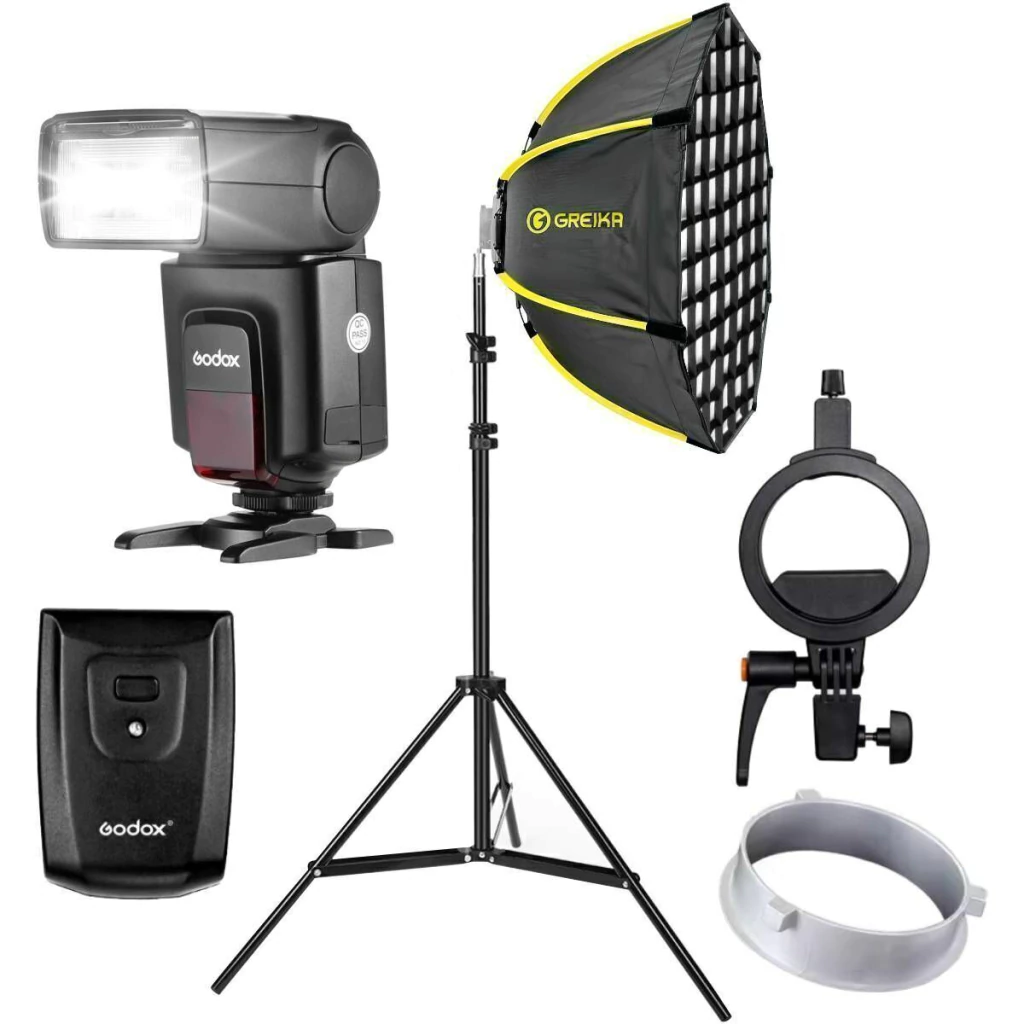 Esse combo está INCLUSO rádio flash universal Godox, o que permite disparar o flash à distância.