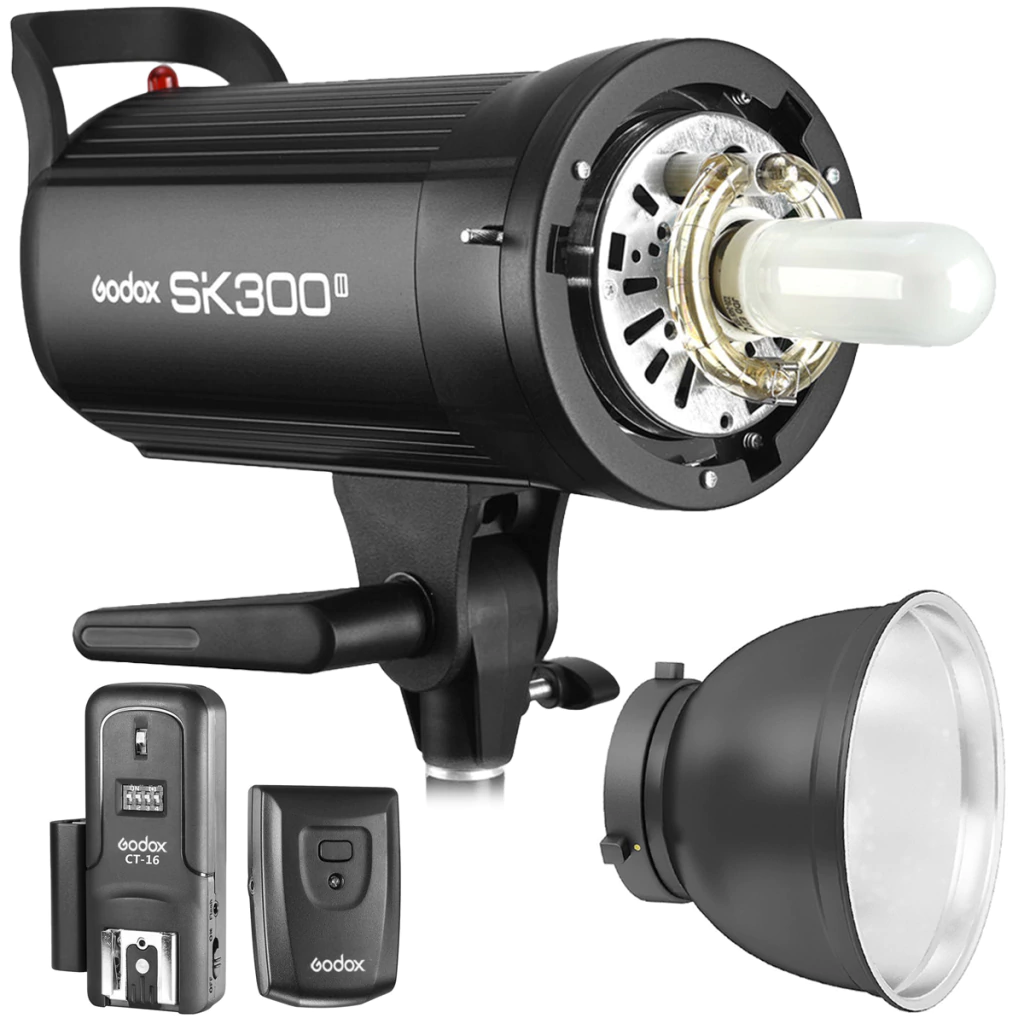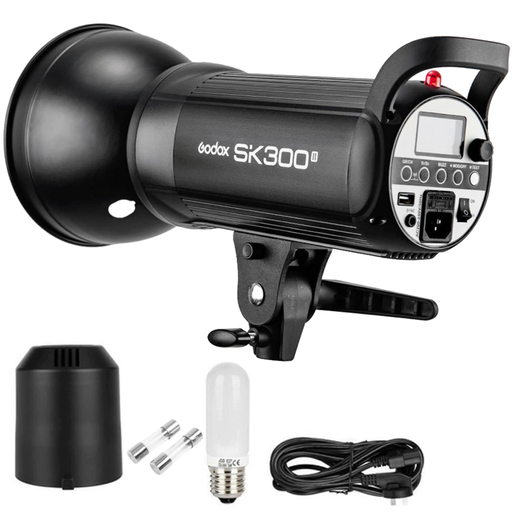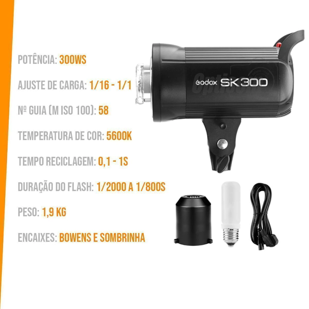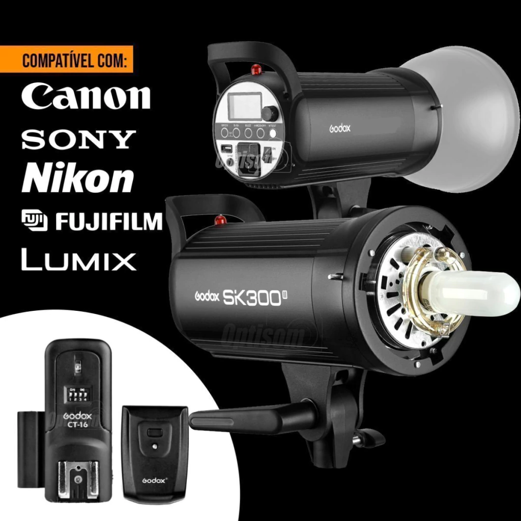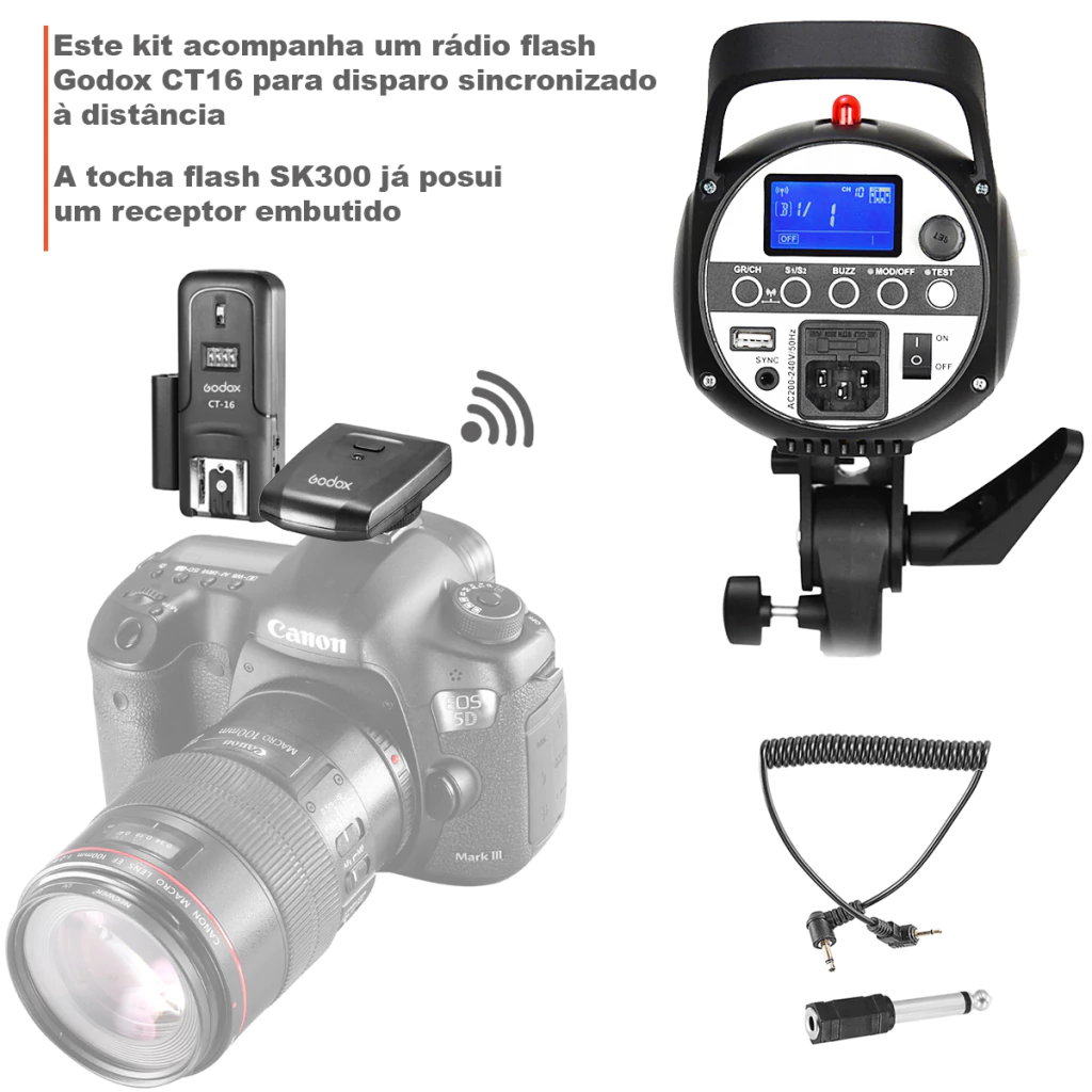 SK300II Series Godox é um flash de ótimo custo-benefício para e-commerce, still, produtos, retrato e fotografia de vida. em pequenas e médios estúdios, ele pode funcionar como luz principal, luz de fundo ou luz de cabelo. Acompanha uma panela refletora, com a função de direcionar e focalizar a luz mais diretamente no assunto.