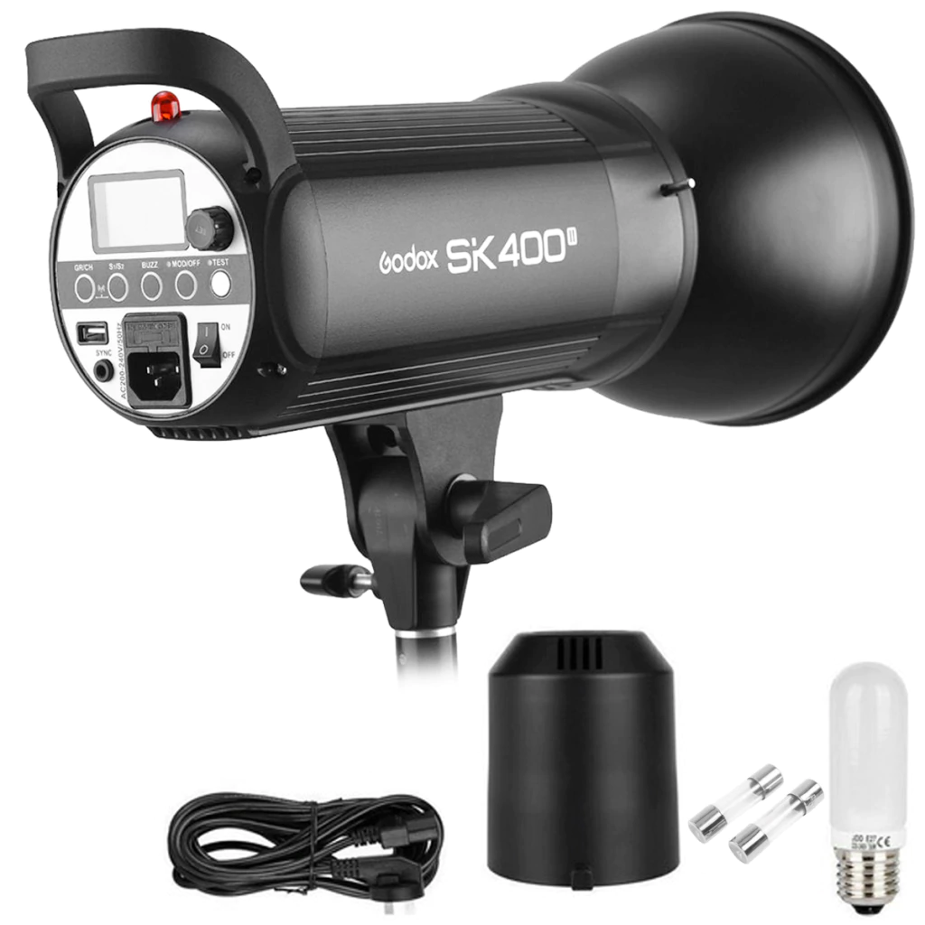 SK400II Series Godox 110V é um flash de ótimo custo-benefício para e-commerce, still, produtos, retrato e fotografia de vida. em pequenas e médios estúdios, ele pode funcionar como luz principal, luz de fundo ou luz de cabelo. Acompanha uma panela refletora, com a função de direcionar e focalizar a luz mais diretamente no assunto.