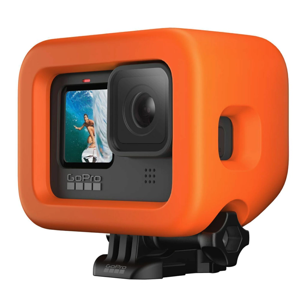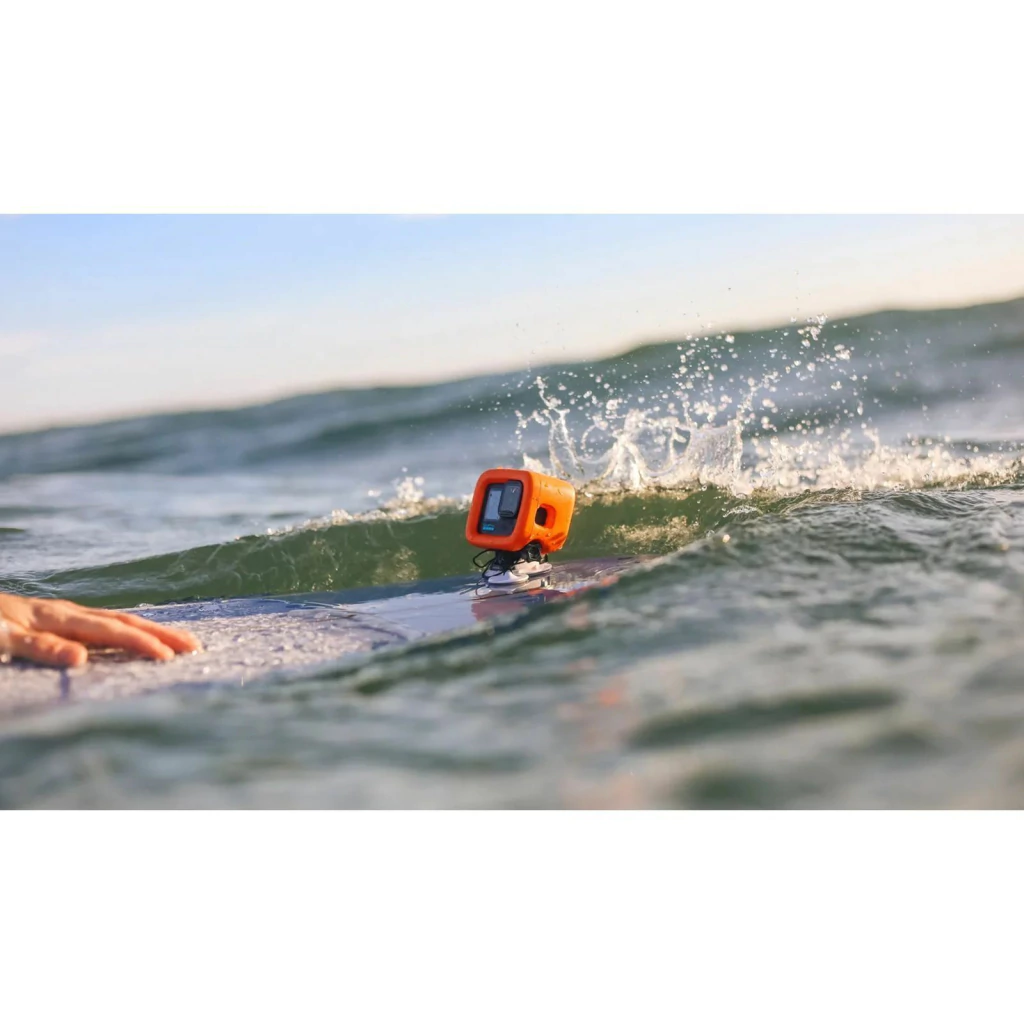 O GoPro Floaty para HERO 9/10/11/12/13 mantém sua câmera flutuando na água se ela cair da sua mão, é laranja brilhante e fácil de localizar.